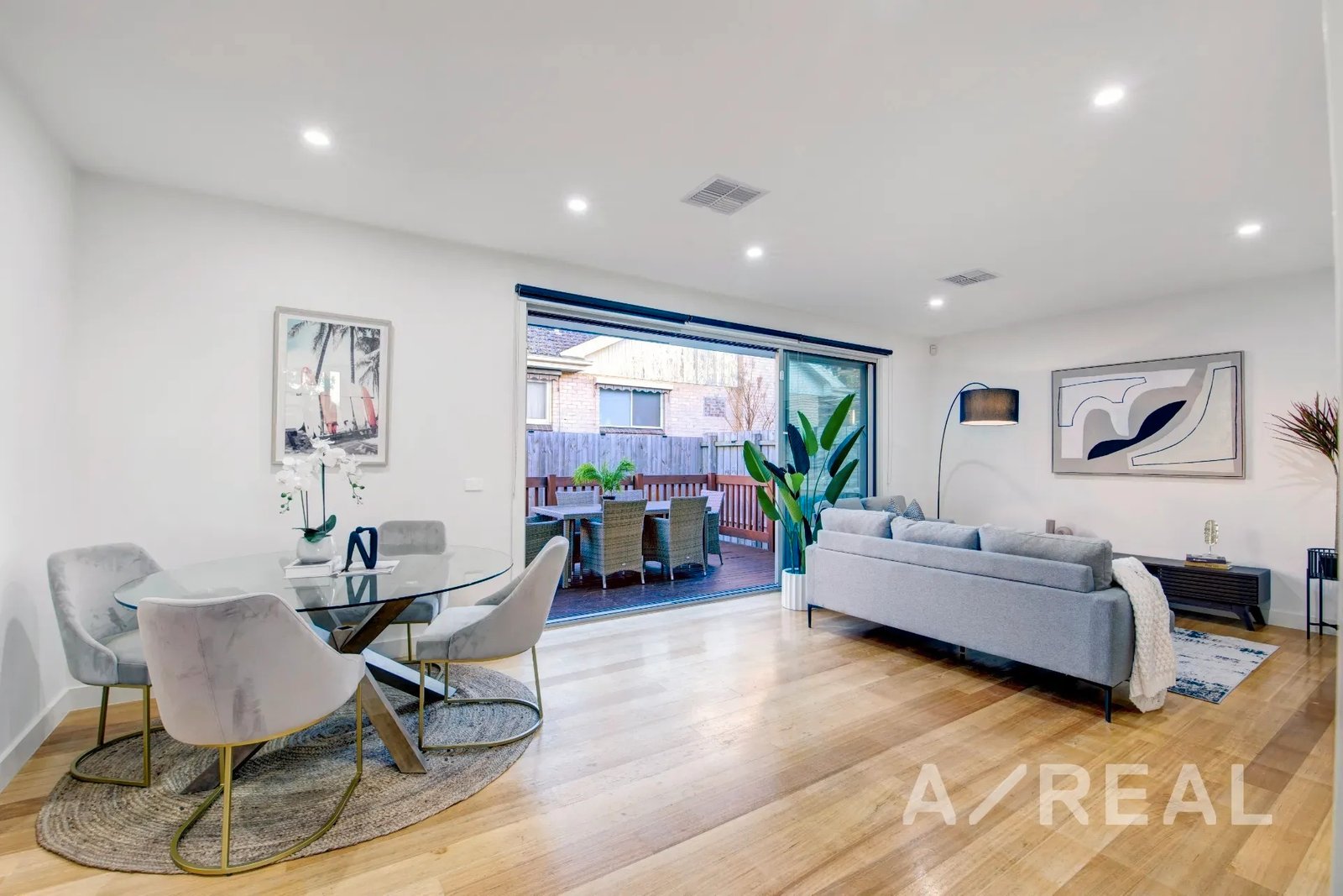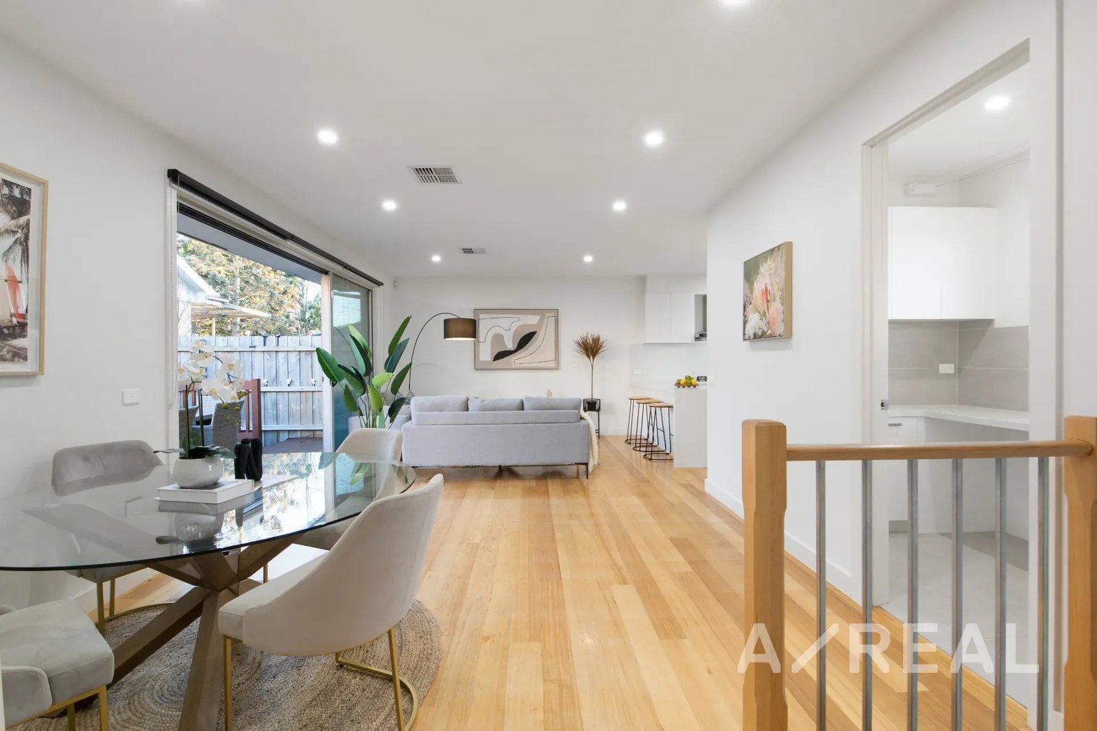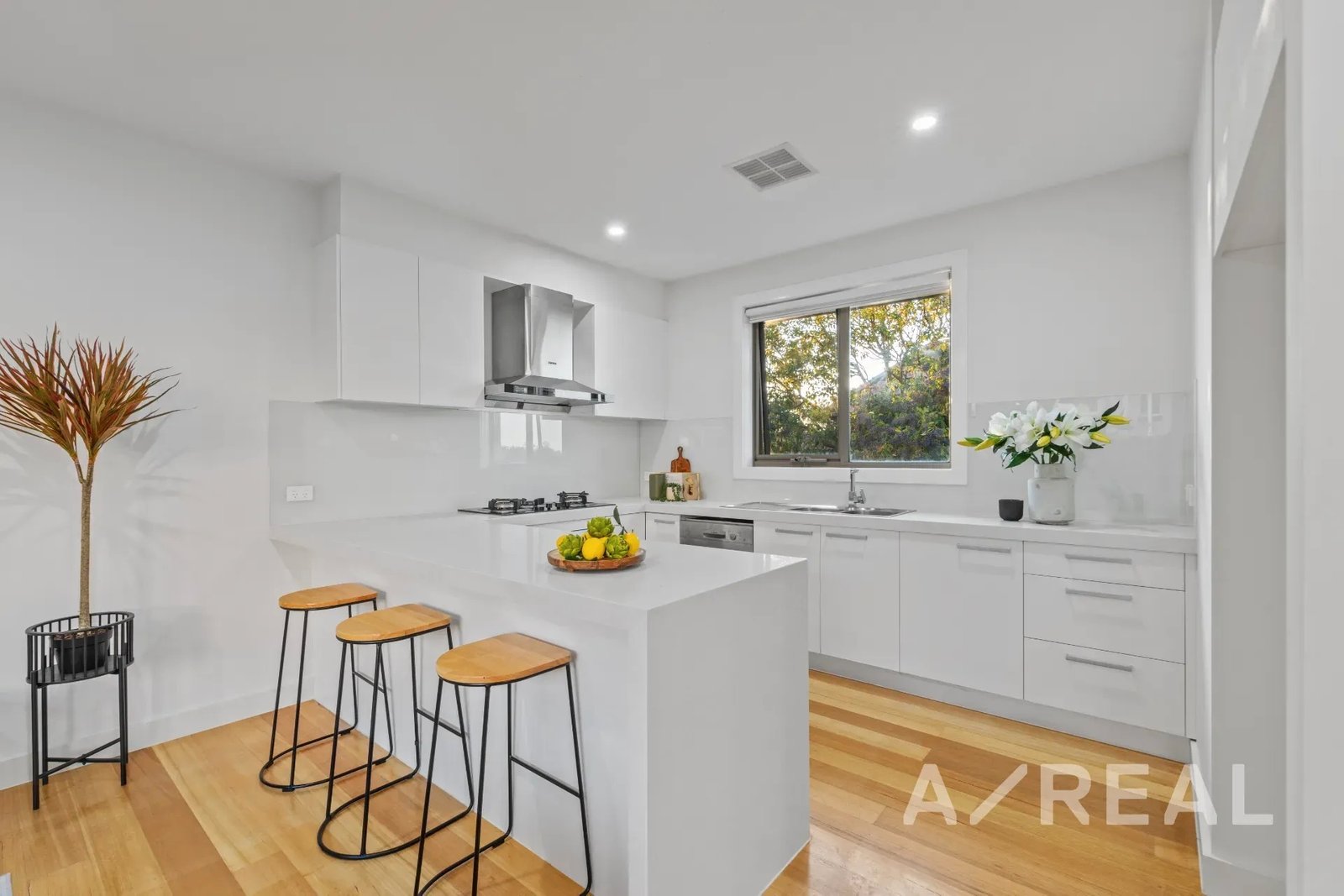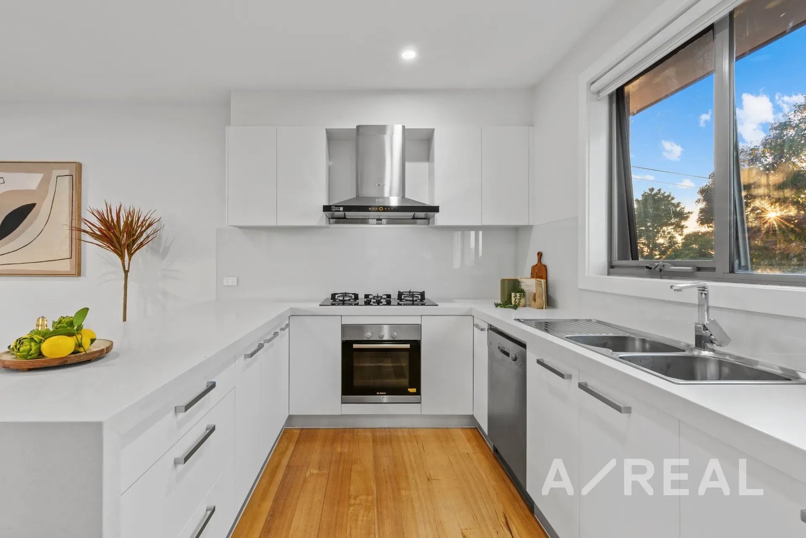 The design is focused on maximising an abundance of beautiful sunlight, while the inclusion of timber floors brings warmth to the vast living room and striking crisp-white kitchen/meals area featuring stainless steel appliances, island bench and stone surfaces.