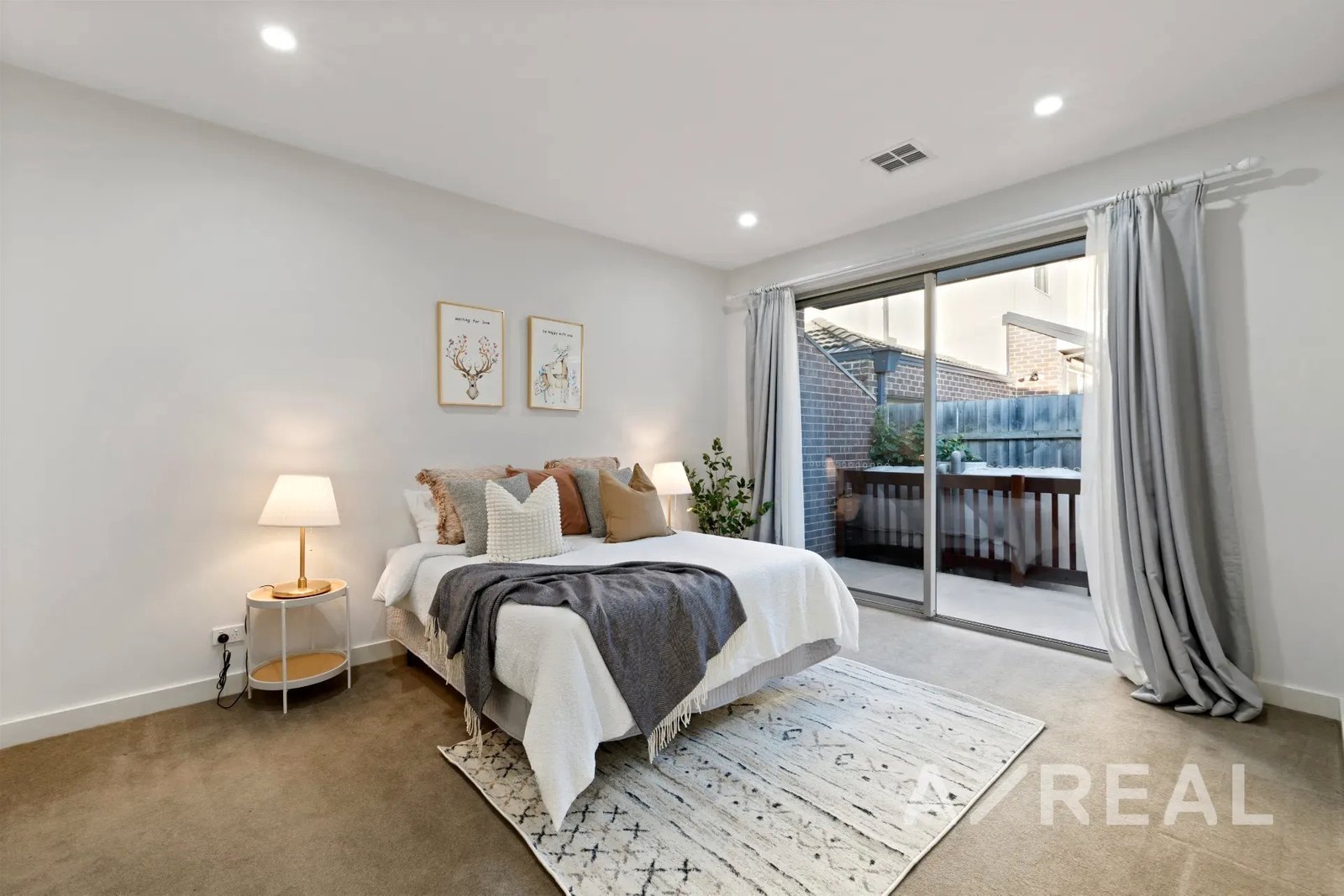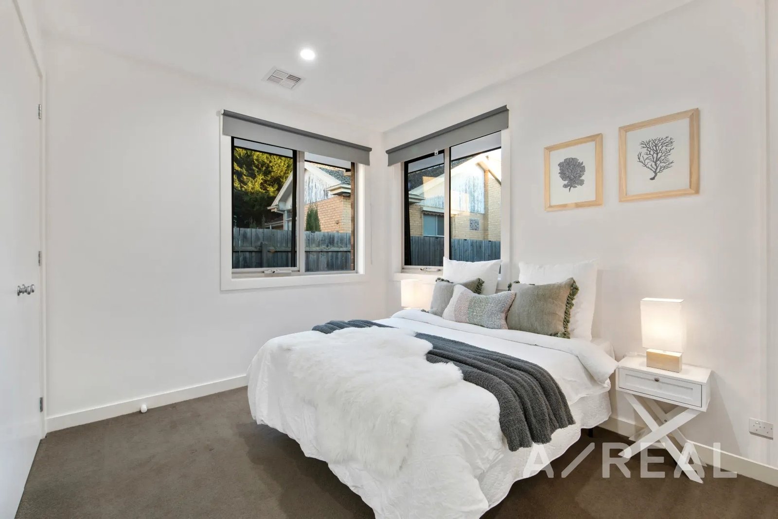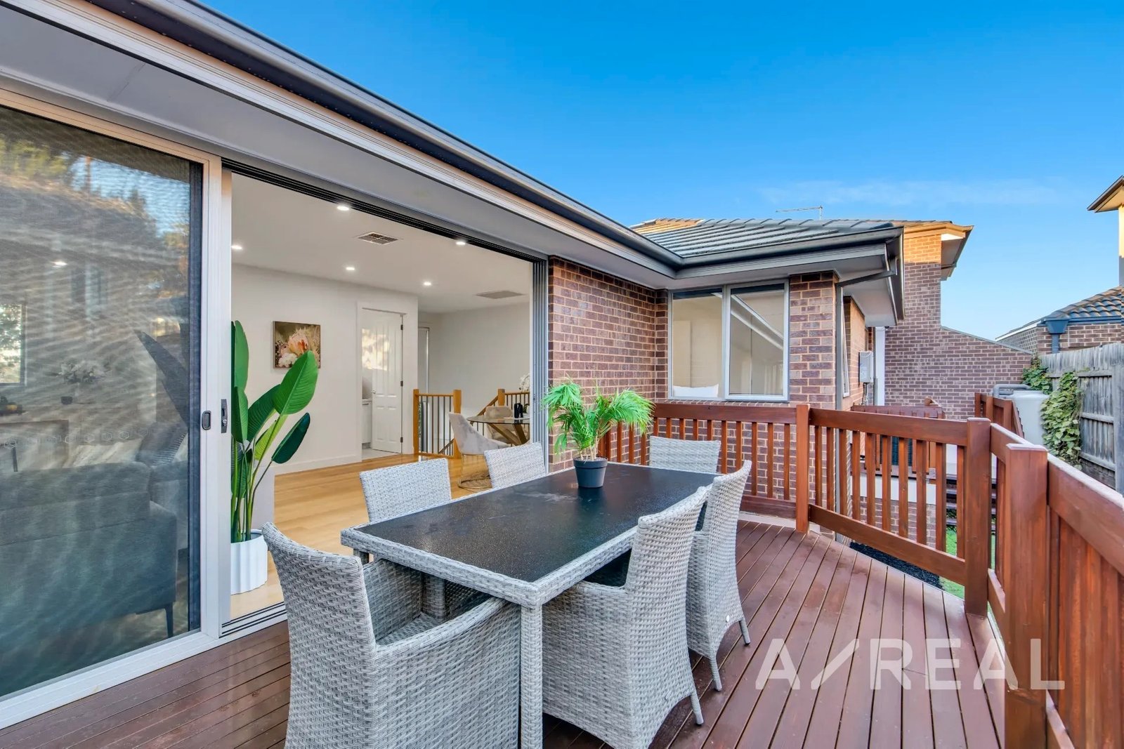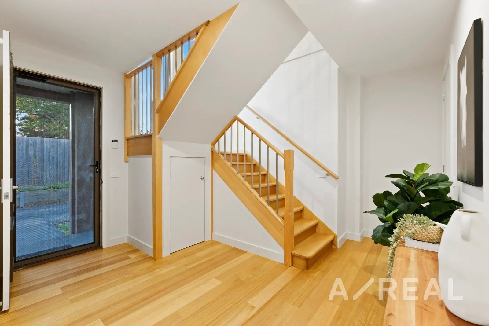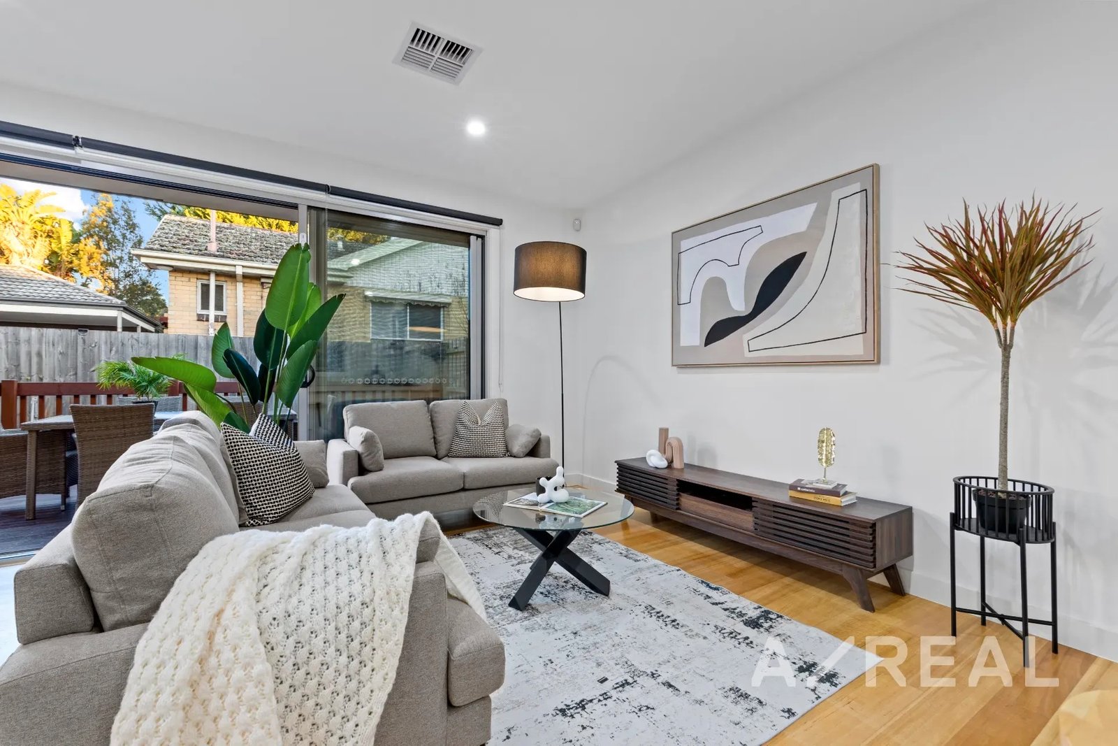 The design is focused on maximising an abundance of beautiful sunlight, while the inclusion of timber floors brings warmth to the vast living room and striking crisp-white kitchen/meals area featuring stainless steel appliances, island bench and stone surfaces.