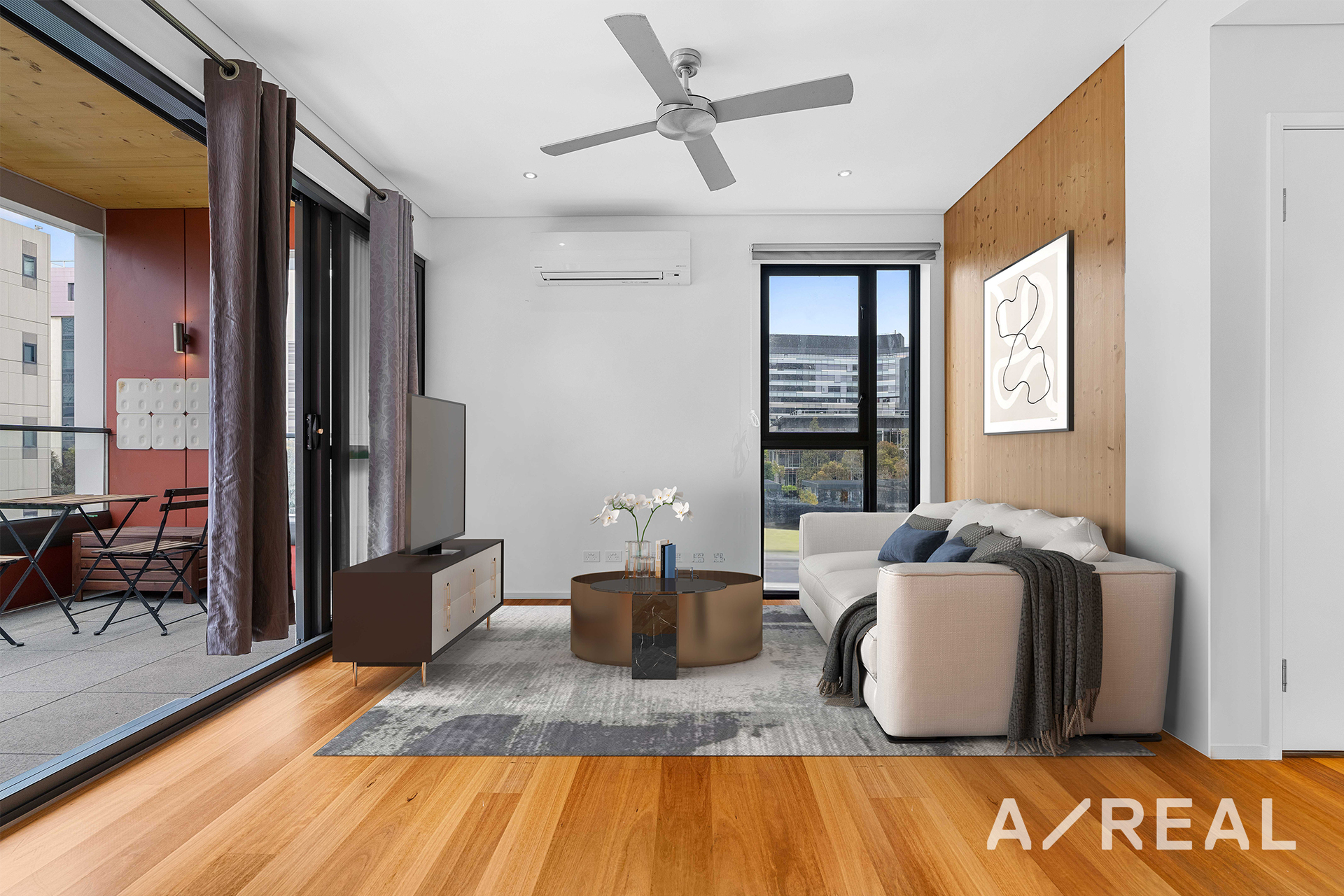 Boasting an open-plan living space adorned with stunning timber flooring, plush bedroom carpets, and sleek handleless cabinets in the kitchen, this apartment exudes contemporary elegance. Enjoy the peace provided by double-glazed windows and balcony doors and relax in air-conditioned comfort in the light-filled living area.