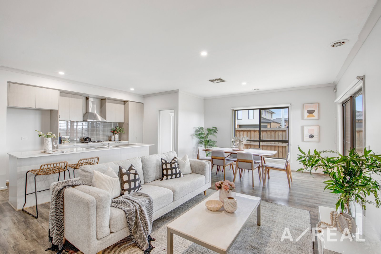 Undeniable contemporary excellence is exemplified in the dual-zoned layout, with a formal lounge leading to light-filled open-plan living/dining, including a sleek kitchen finished with stone surfaces, breakfast bench and quality appliances.