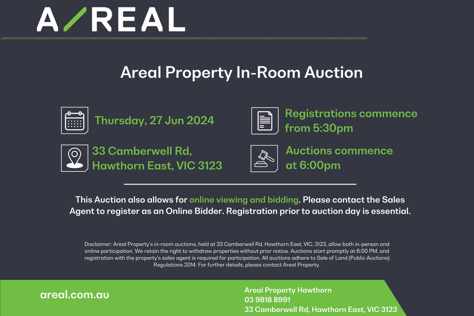 Areal Property's in-room auctions, held at 33 Camberwell Rd, Hawthorn East, VIC, 3123, allow both in-person and online participation. We retain the right to withdraw properties without prior notice. Auctions start promptly at 6:00 PM, and registration with the property's sales agent is required for participation. All auctions adhere to Sale of Land (Public Auctions) Regulations 2014. For further details, please contact Areal Property.