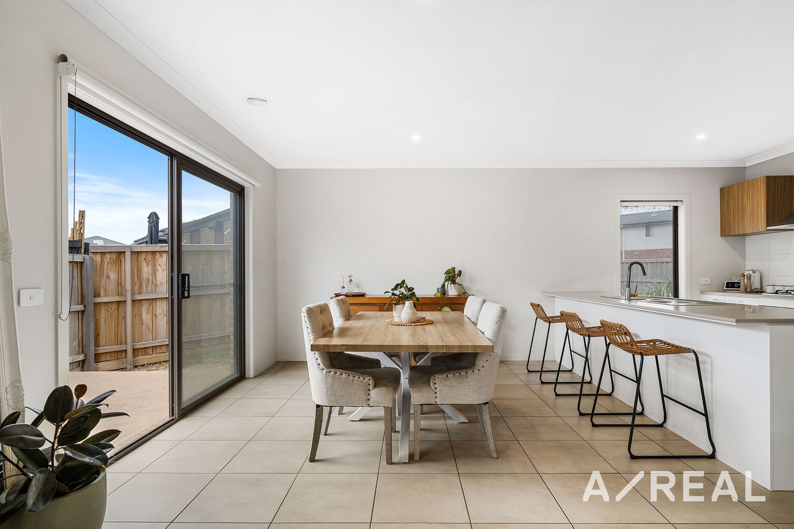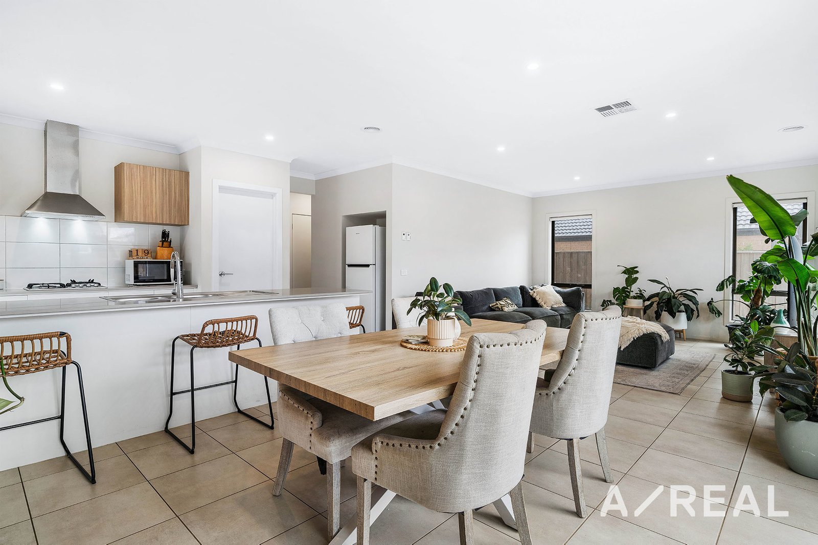 The interiors are characterised by sophisticated design and modern hues, that accentuate a formal sitting area, flowing through to the hub of the home, where light-filled open-plan living/dining merges effortlessly with a gourmet kitchen featuring stone surfaces, large breakfast bench, WIP and quality stainless steel appliances.
