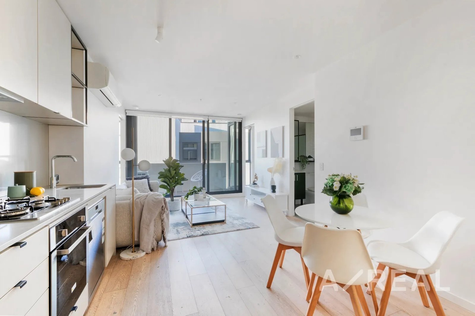 Welcomed by timber floors and beautiful natural light, sophisticated spaces reveal a free-flowing living/dining environment of impressive proportions, and incorporating a deluxe stone-topped kitchen.
