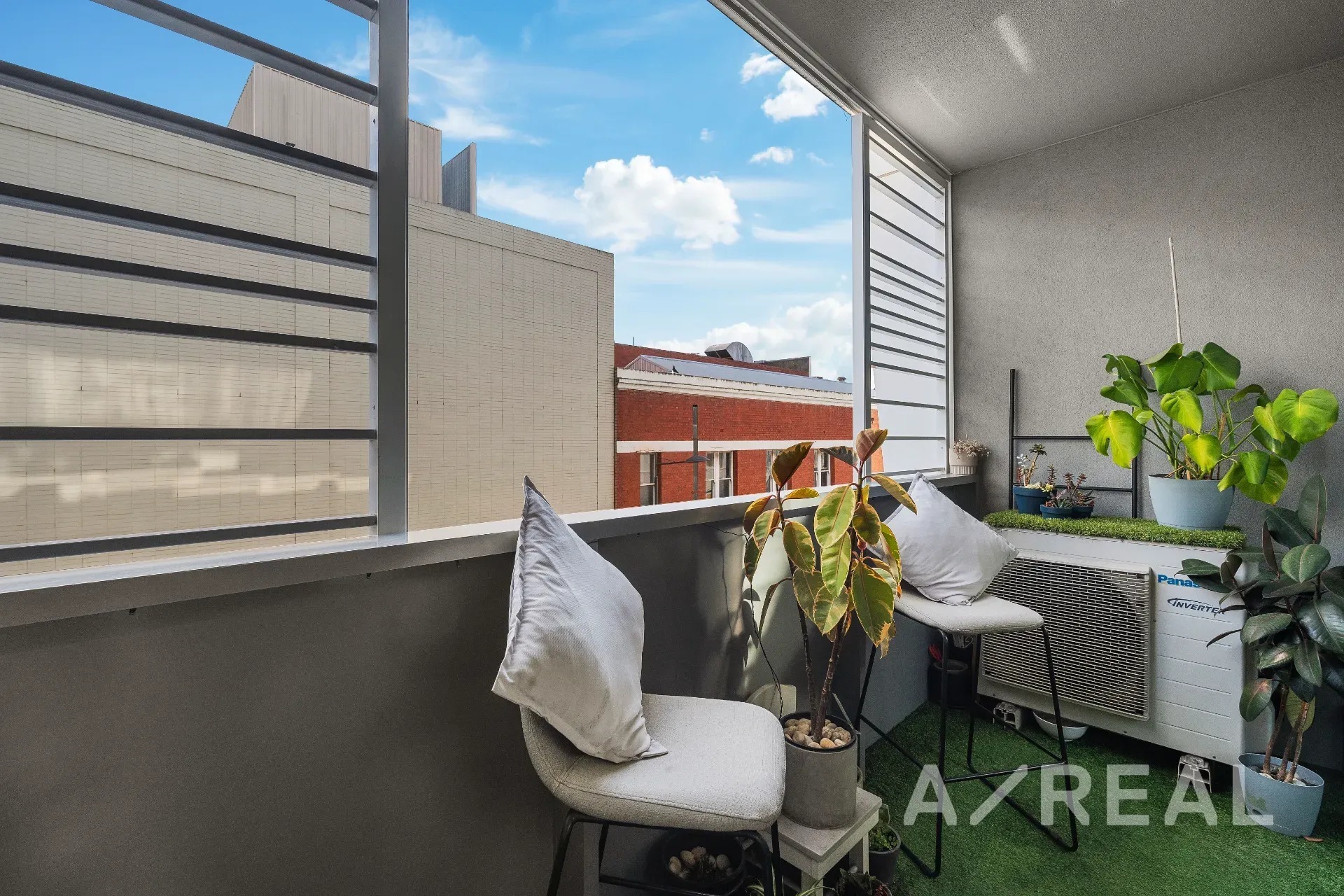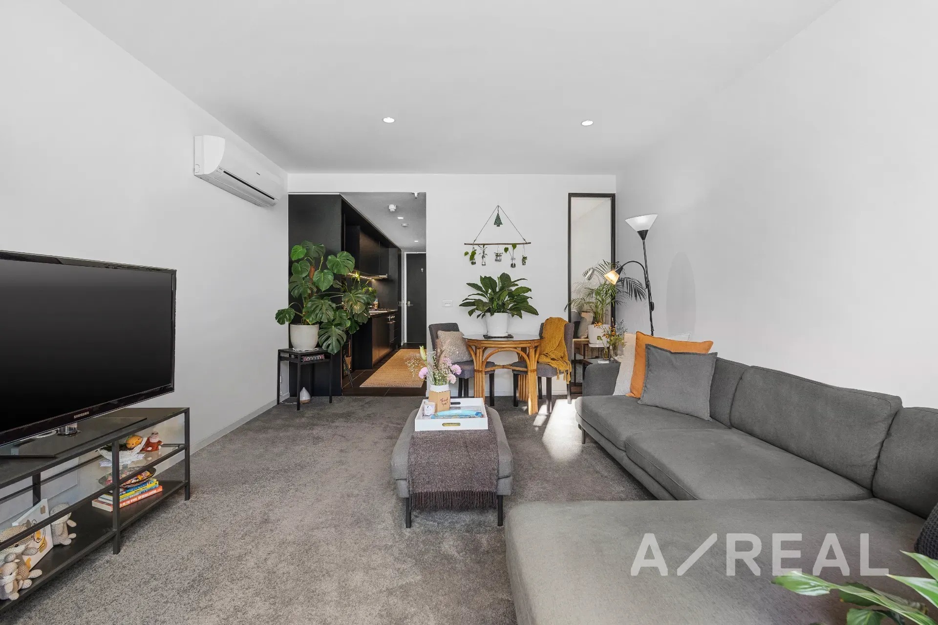 The open-plan living/dining zone features split system heating/AC for optimum comfort, and is enhanced by full-height wall-to-wall windows to maximise natural light – also providing a seamless connection to a private north-facing balcony.