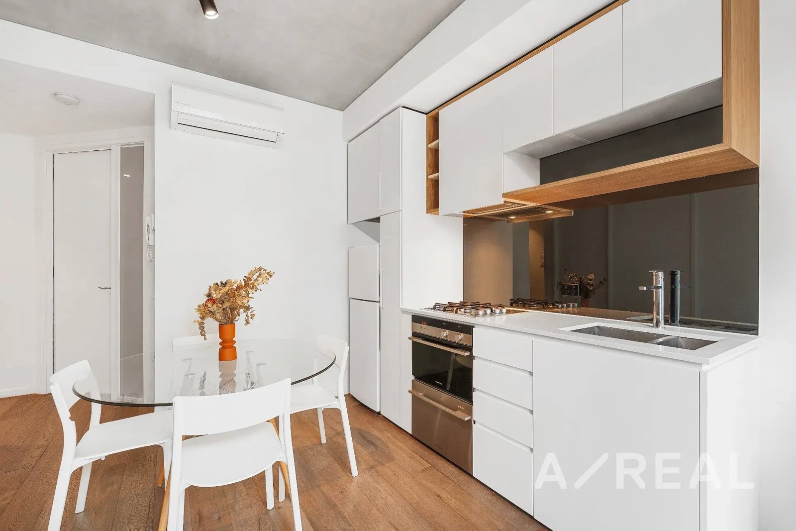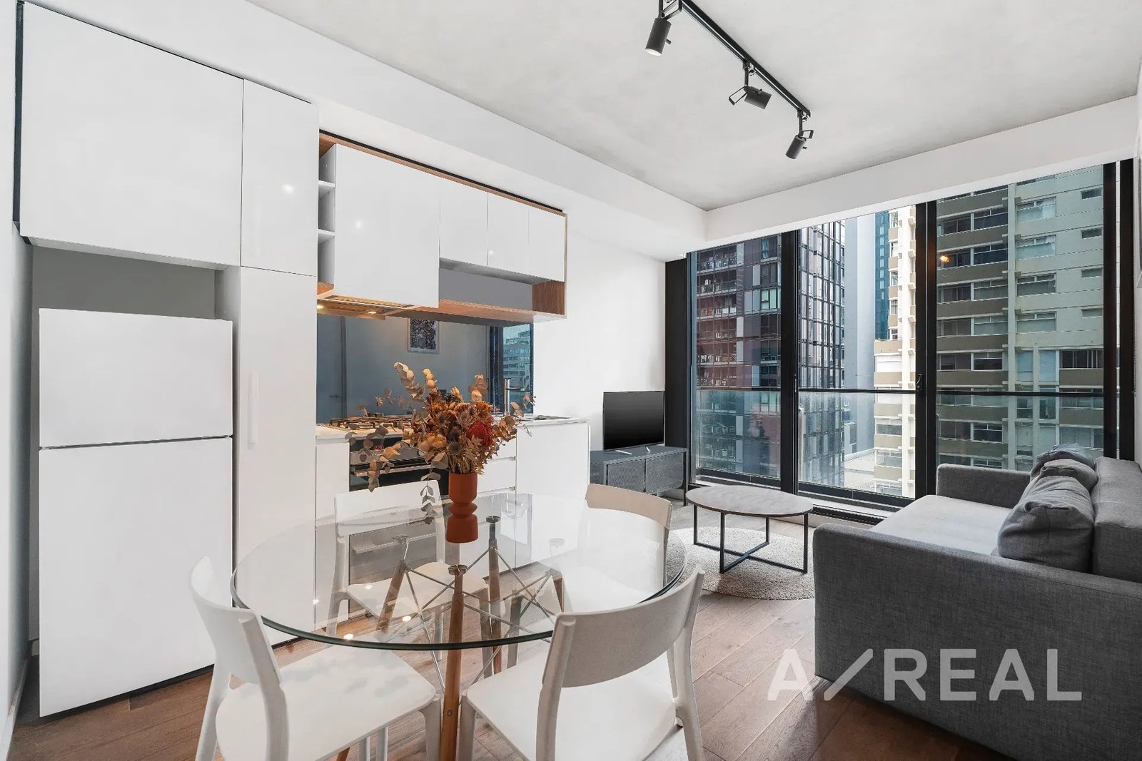 Finished to impeccable standards and enhanced by timber floors and floor-to-ceiling windows, the open-plan design merges living/dining with a well-appointed kitchen, and unfolds to a private entertaining balcony with views of the City streetscape.
