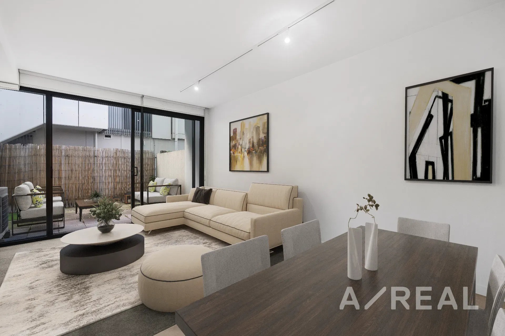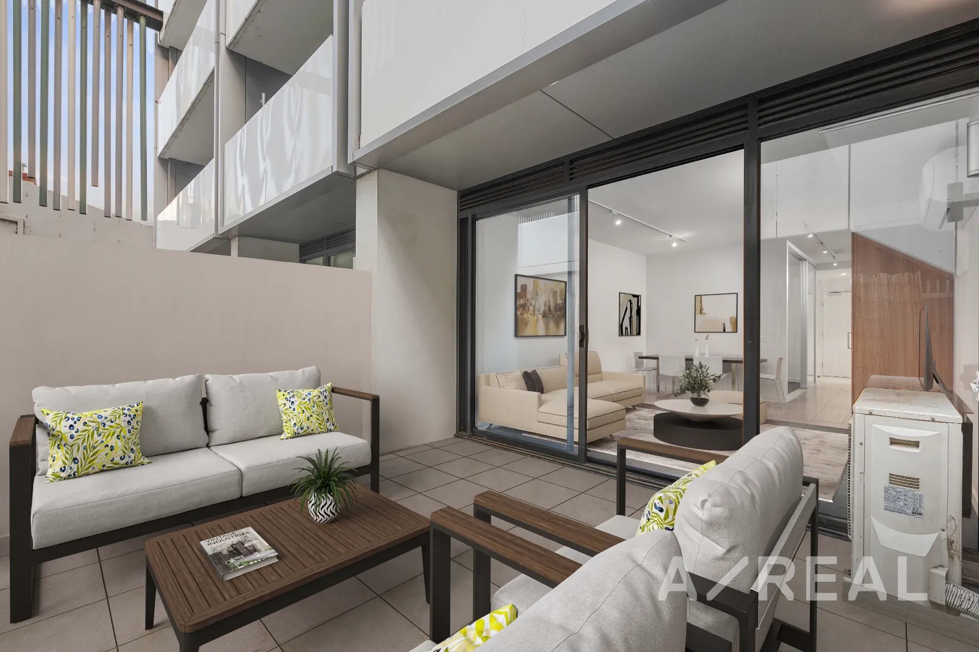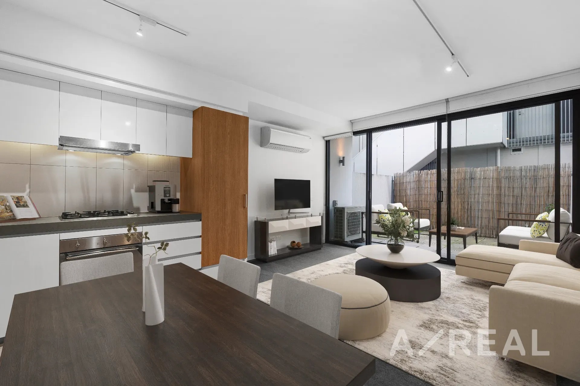 Sleek modern styling and minimalist décor highlight the open-plan living/dining area, impressive stone-topped kitchen, private entertainer's balcony and split system heating/AC.