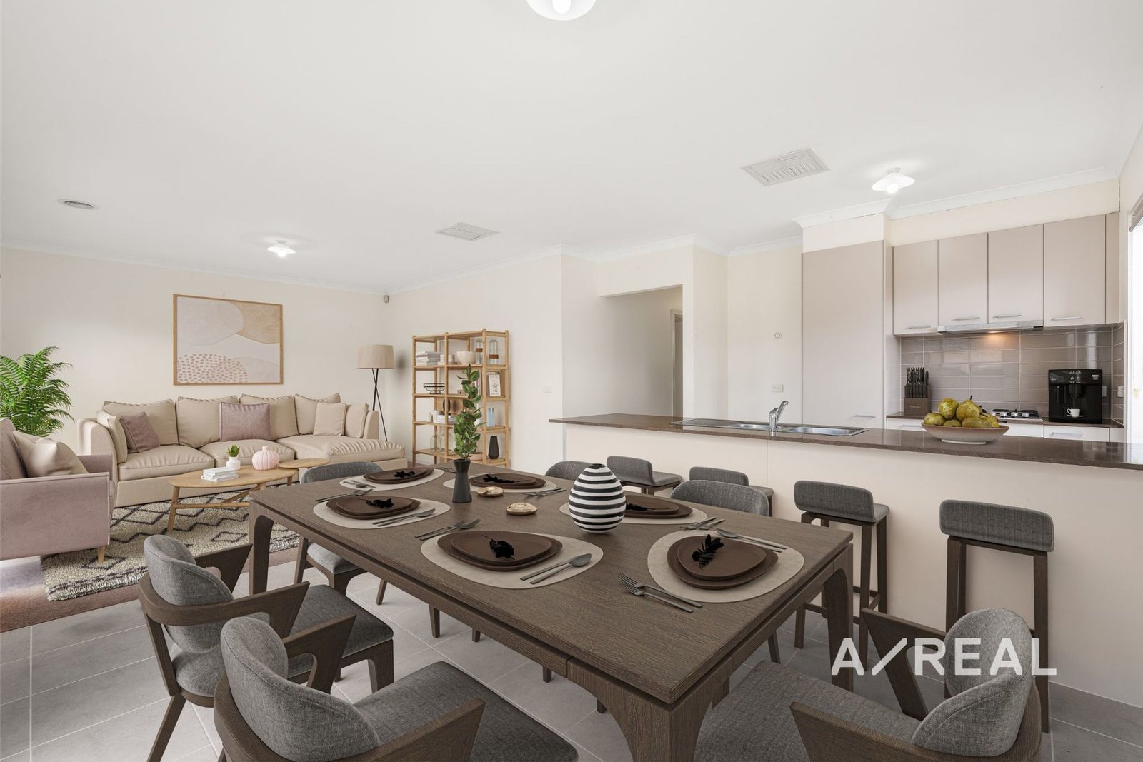 Filled with natural light and desirably open-plan, the spacious living/dining area flows effortlessly into a modern stone-topped kitchen with stainless-steel appliances.