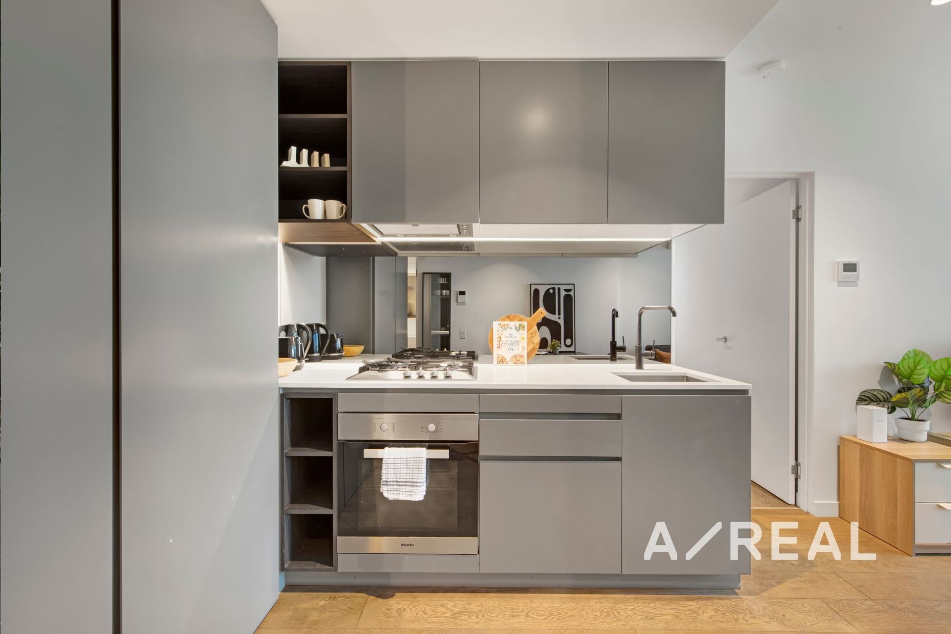 Timber floors, floor-to-ceiling windows and neutral colour scheme add timeless appeal and modern vibrancy to the 2 bedroom, 2 bathroom open-plan layout, including a sleek kitchen boasting Miele appliances, stone benchtops and mirrored splashback.