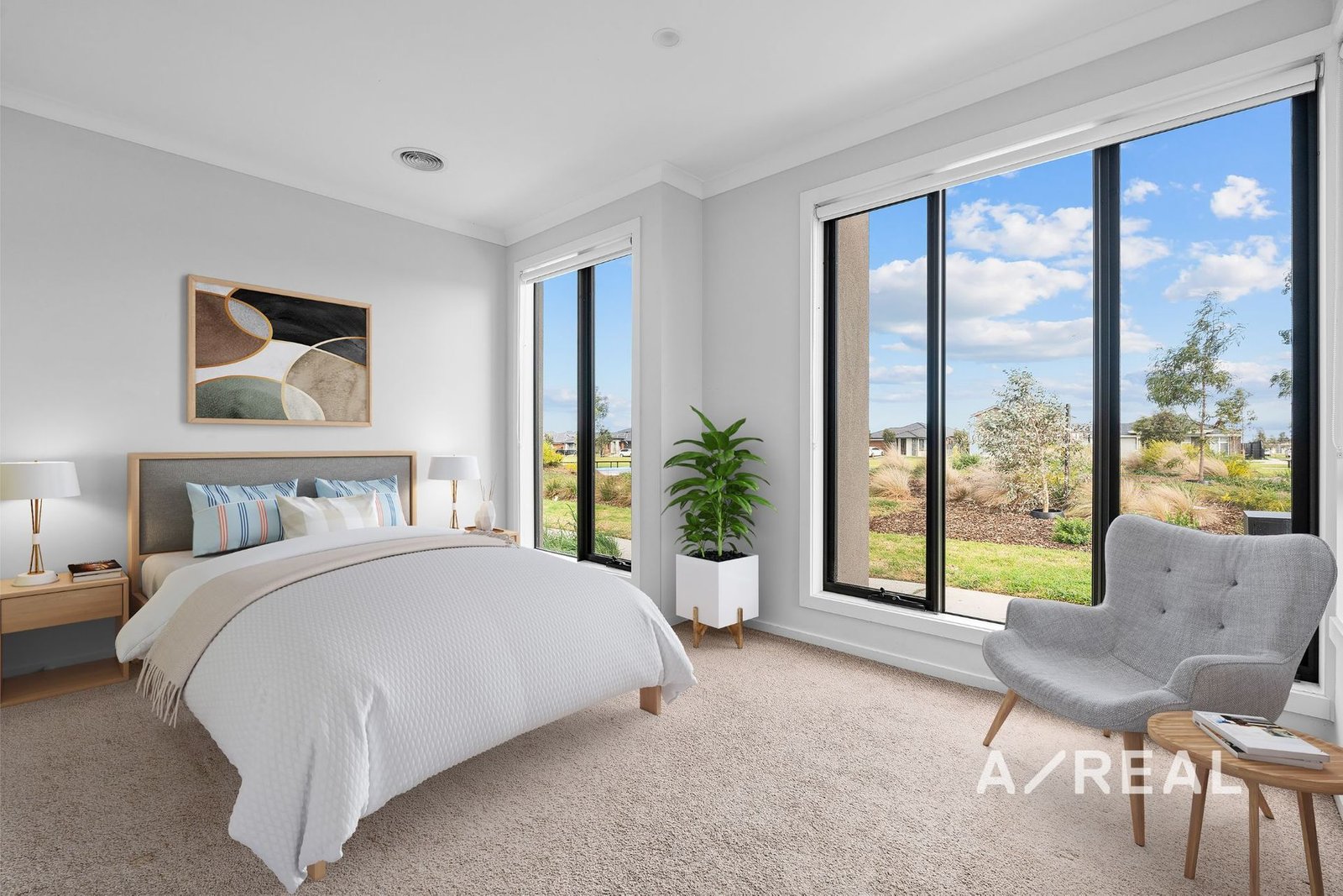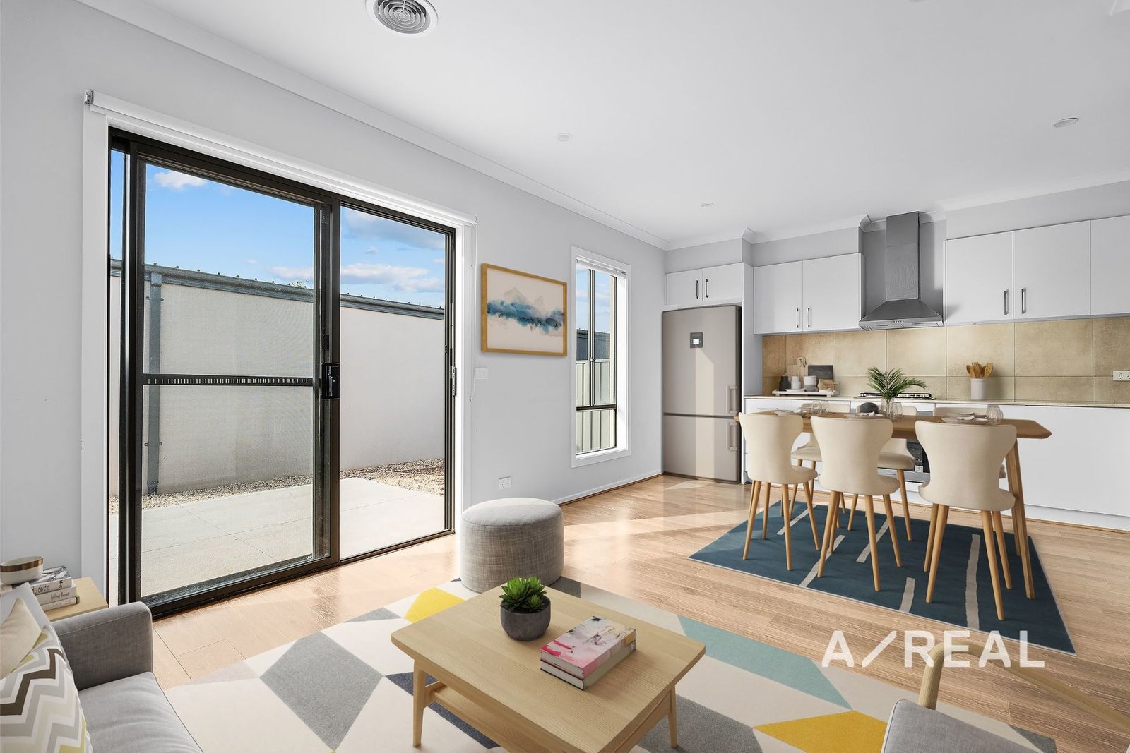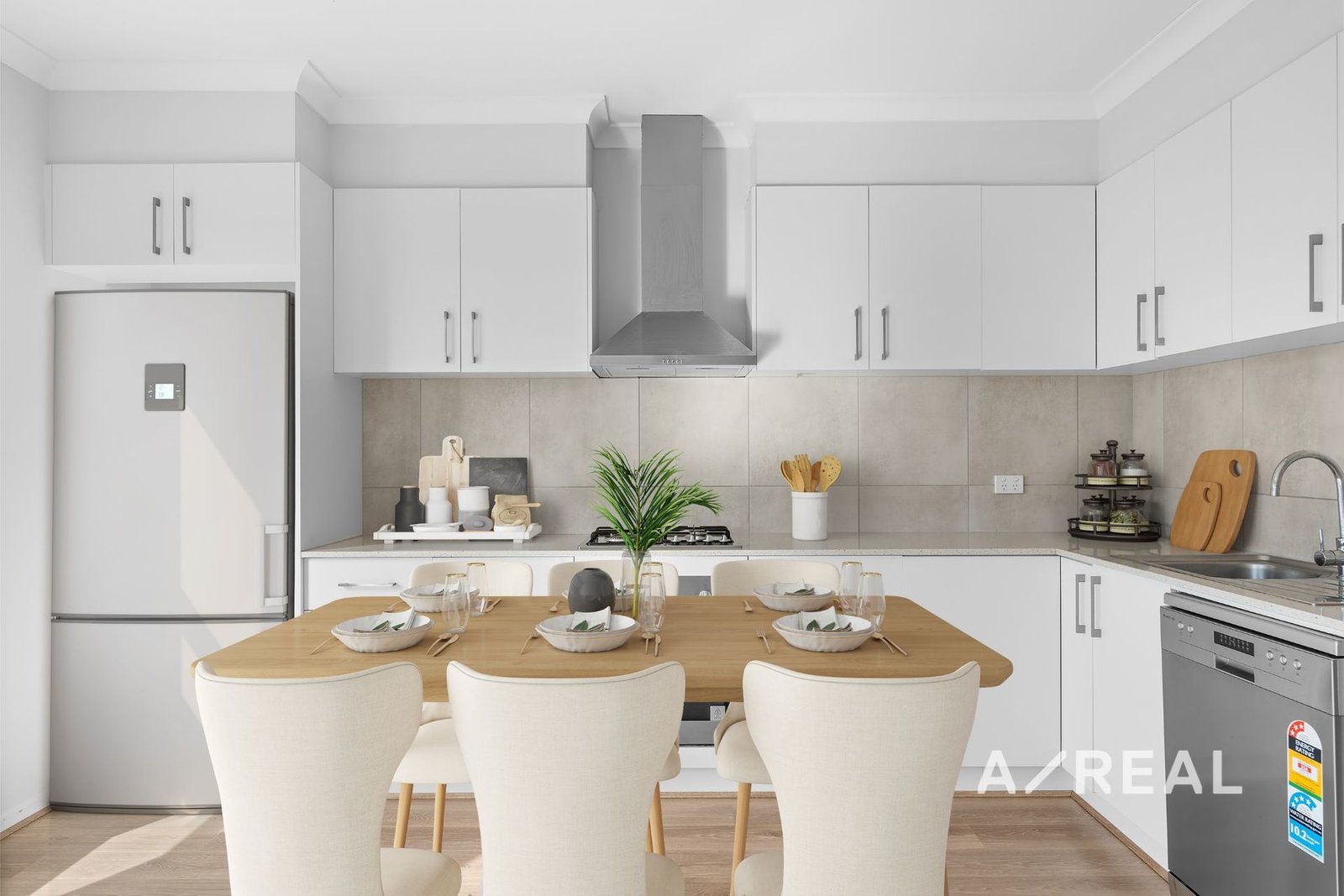 Timber floors and soft neutral tones filter through contemporary interiors, with north-facing open-plan living/dining, complementing a deluxe well-appointed kitchen.