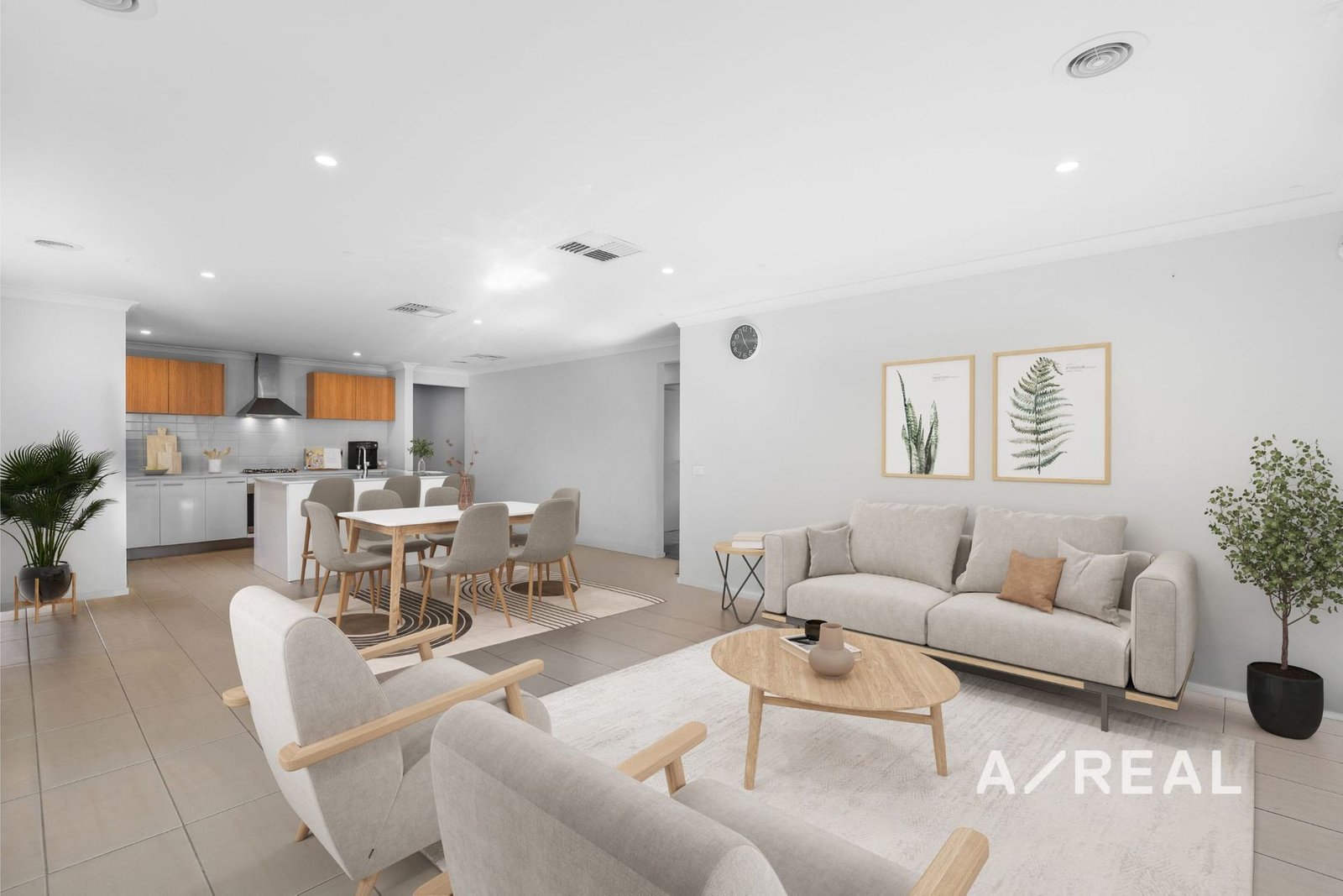 Warm neutral tones, natural light and a welcoming ambience highlight spacious interiors, with open-plan living/dining complementing a gourmet kitchen featuring stone surfaces, island bench, stainless steel appliances and walk-in pantry.