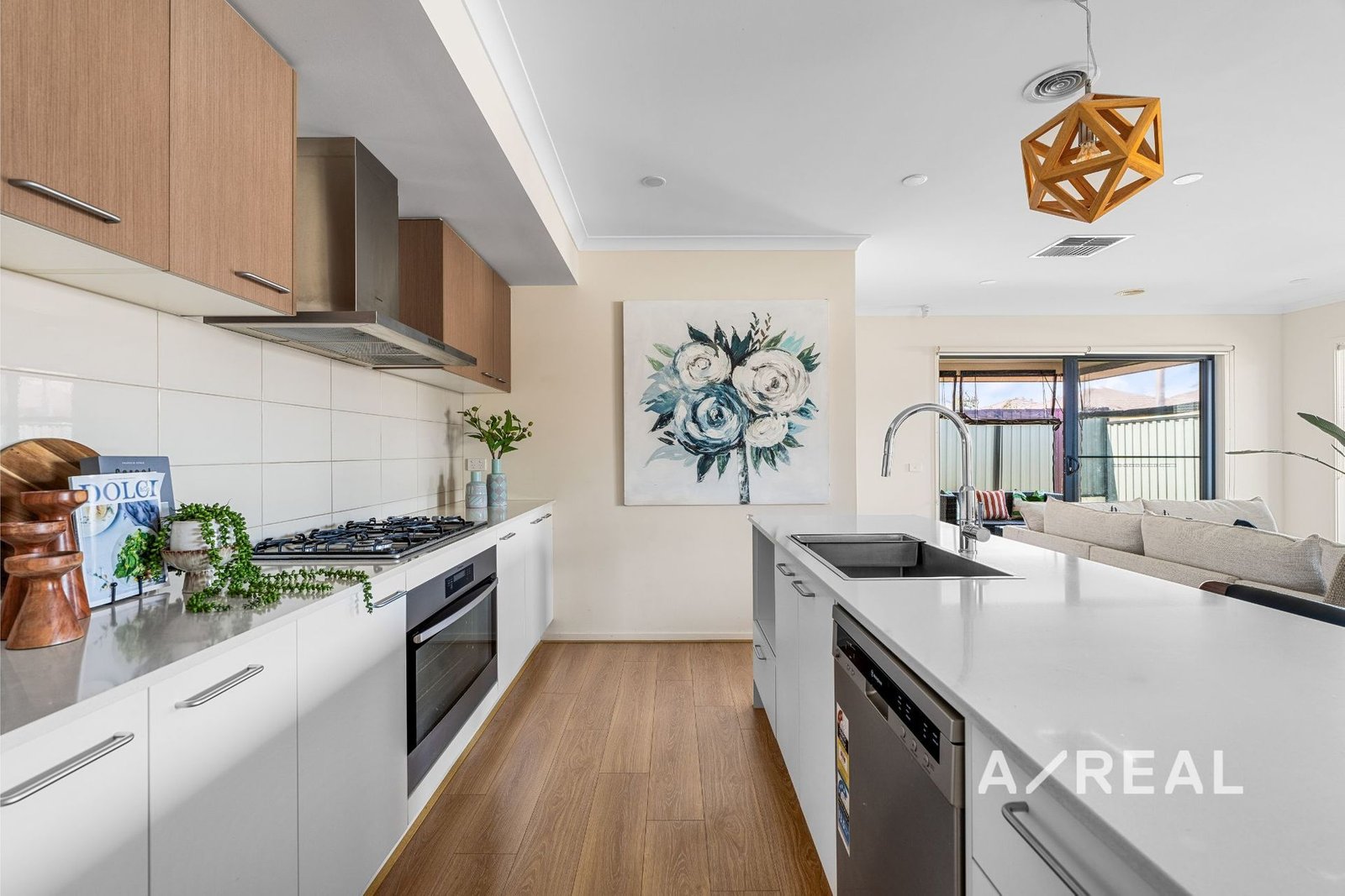Welcomed by beautiful natural light, soft earthy tones and stunning timber floors, the dual-zoned layout provides a family room, accompanied by a sleek kitchen flaunting stone bench tops, walk-in pantry and quality appliances, overlooking the generous open-plan living/dining area.