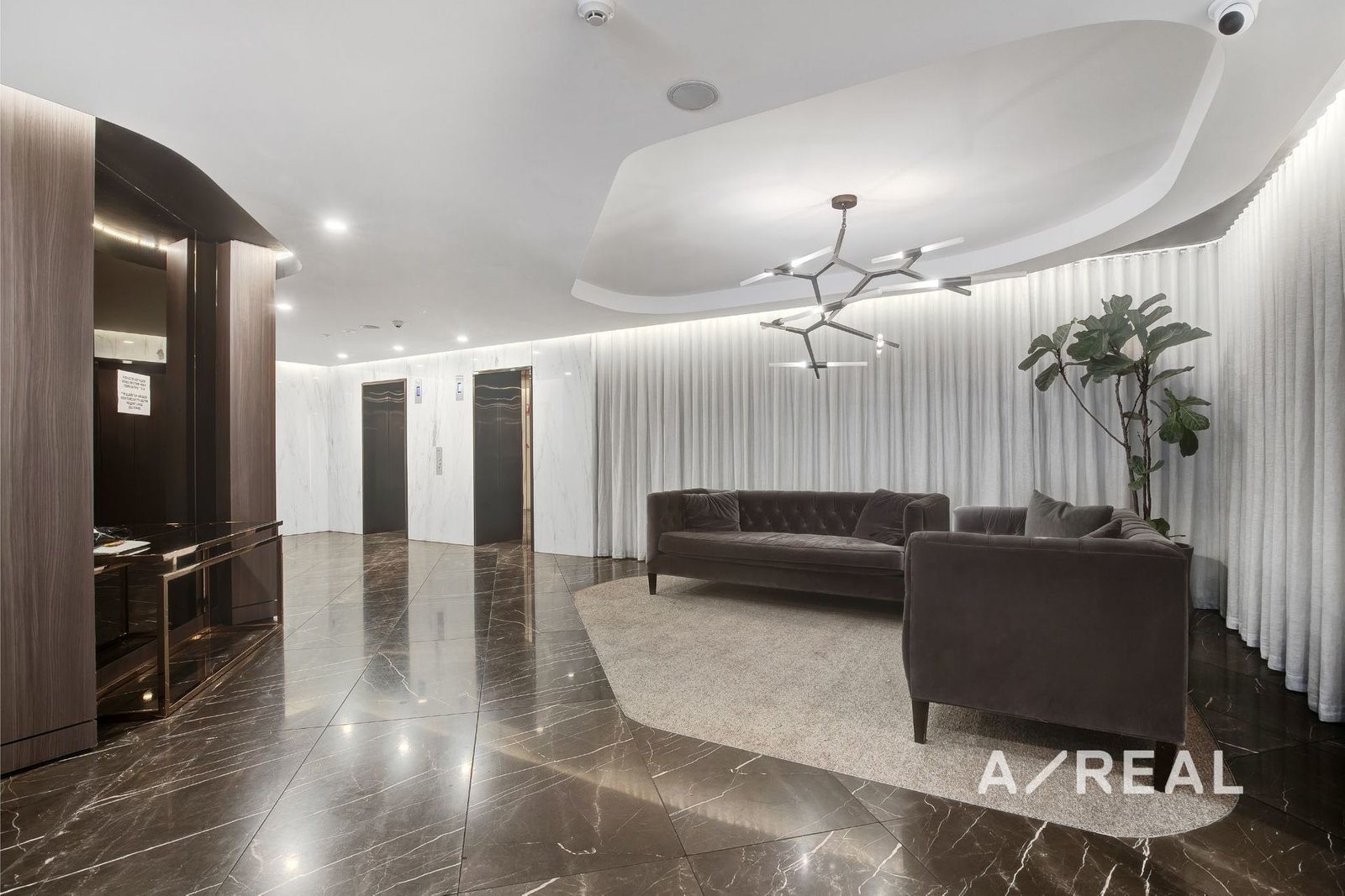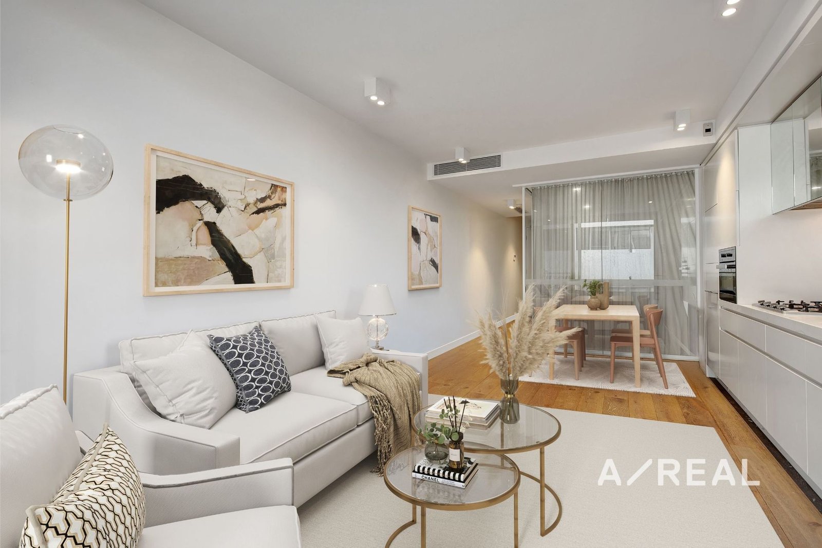 An abundance of natural light pouring in from the floor-to-ceiling windows and the harmonious blend of neutral tones and timber floors, define the seamless open-plan design, including a sleek kitchen luxuriously appointed with stone benchtops, Miele appliances, ample storage and integrated fridge/freezer.