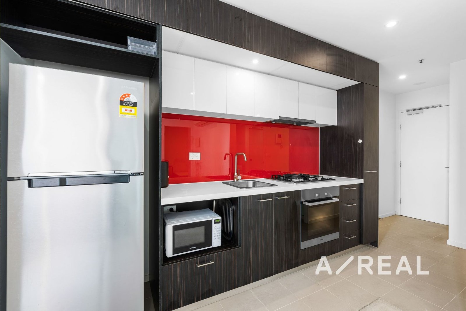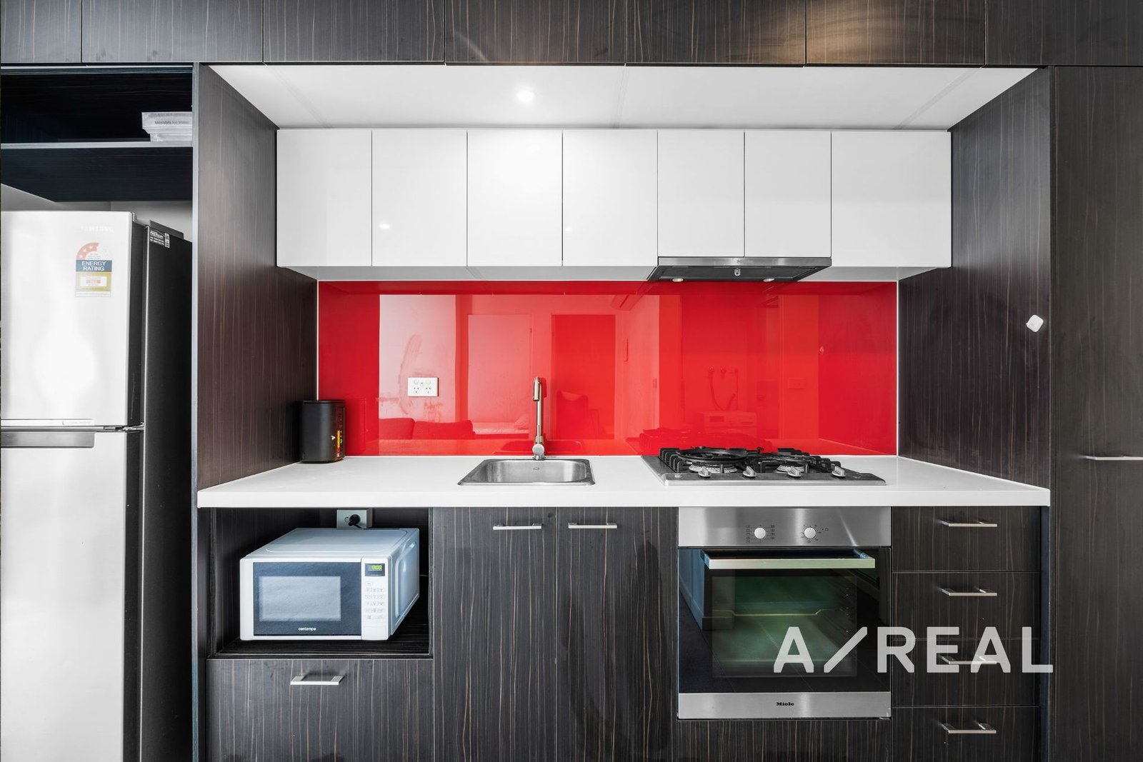 A modern ambience filters through open-plan living/dining, complemented by a sleek kitchen luxuriously appointed with Miele appliances, stone surfaces and chic splashback, private northerly balcony and heating/AC.