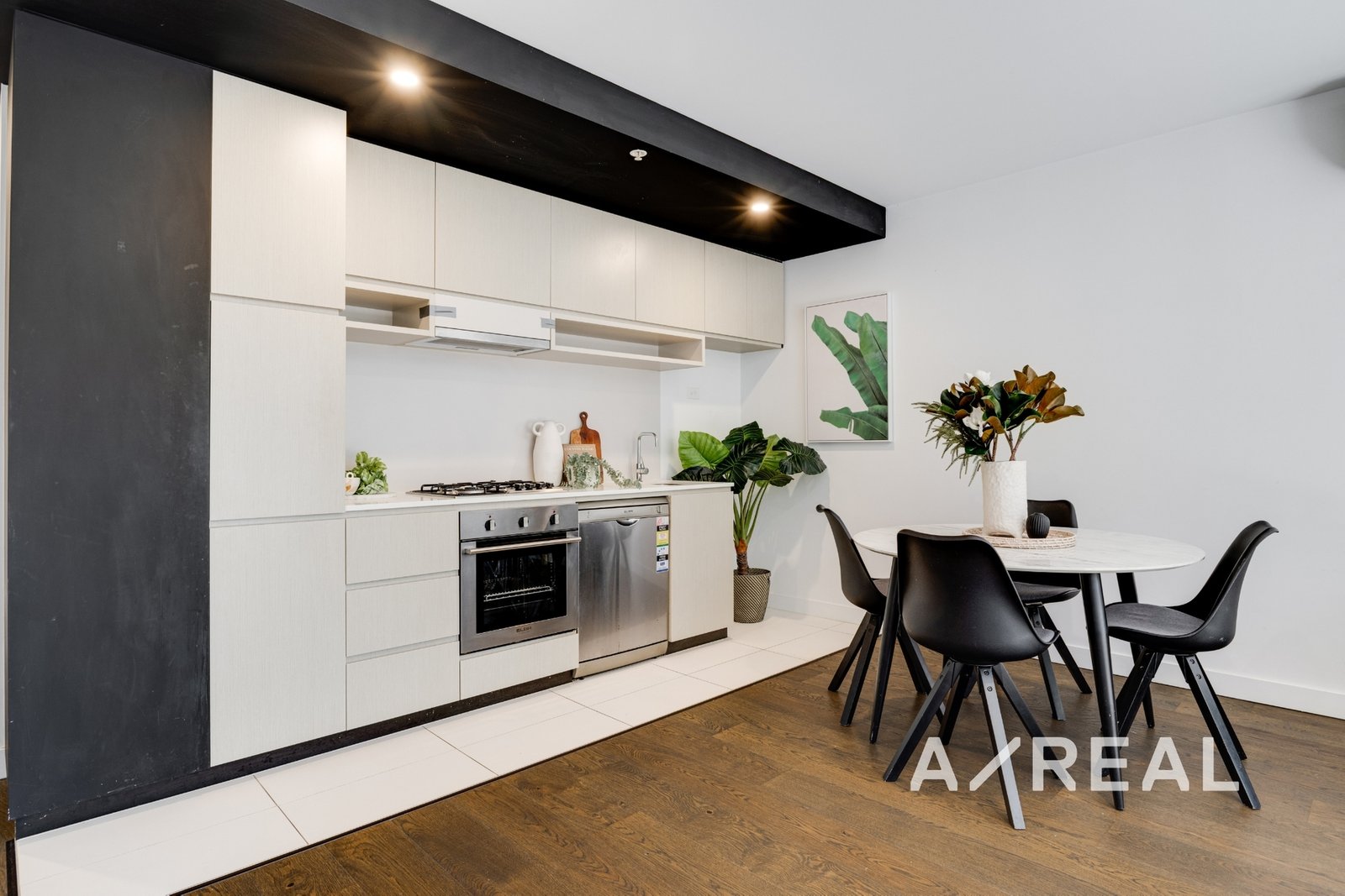 Underscored by timber floors, the open-plan living/dining area is soaked in natural light, captures leafy views, and is served by a sleek kitchen luxuriously appointed with stone benchtops, premium appliances, ample storage and integrated fridge/freezer.