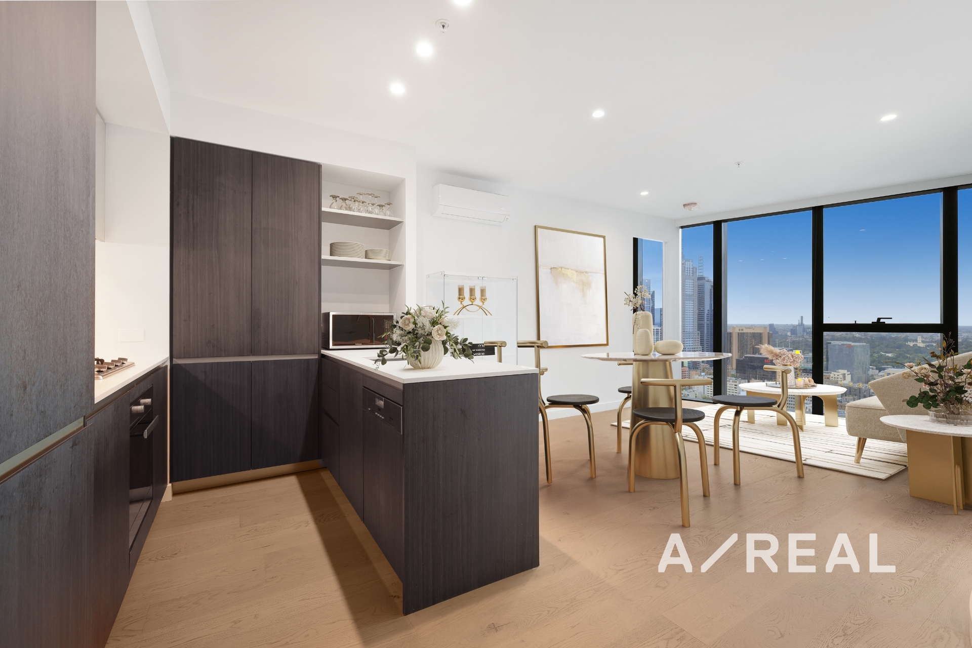 High-end finishes and timber floors enrich the open-plan living and dining area, overlooked by a sleek kitchen boasting stone benchtops, Miele appliances and an integrated fridge/freezer, plus access to a private balcony.