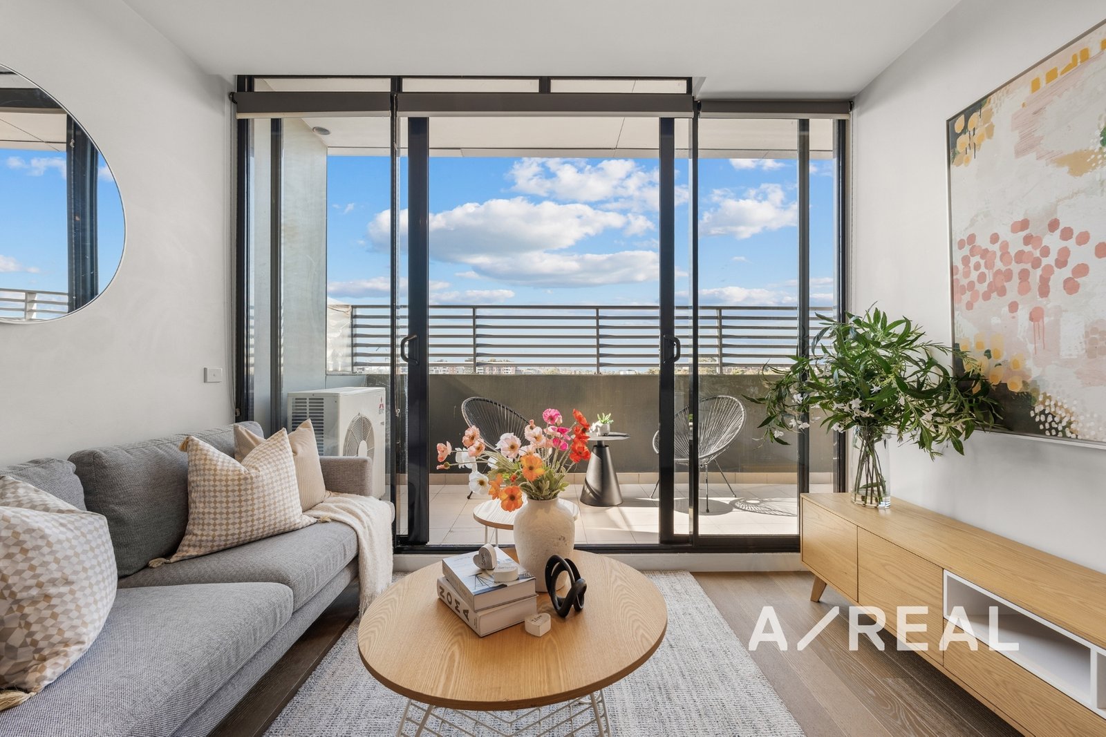 Contemporary interiors are highlighted by calming neutral tones, high-end finishes and timber flooring, adding sophistication to the light-filled open-plan living/dining area, and sleek stone-topped kitchen showcasing premium Smeg appliances including semi-integrated dishwasher. A covered entertainer's balcony adds further allure, while heating/AC and secure entry ensure comfort and convenience.