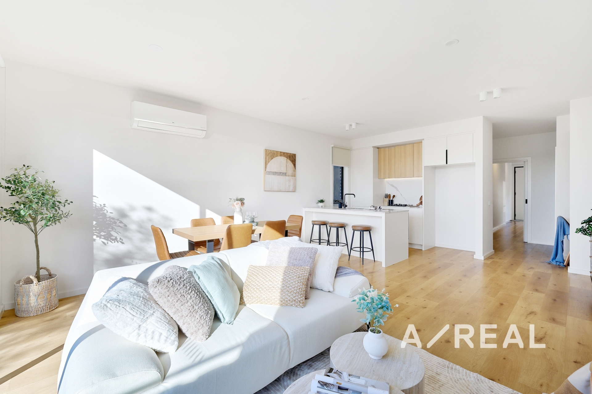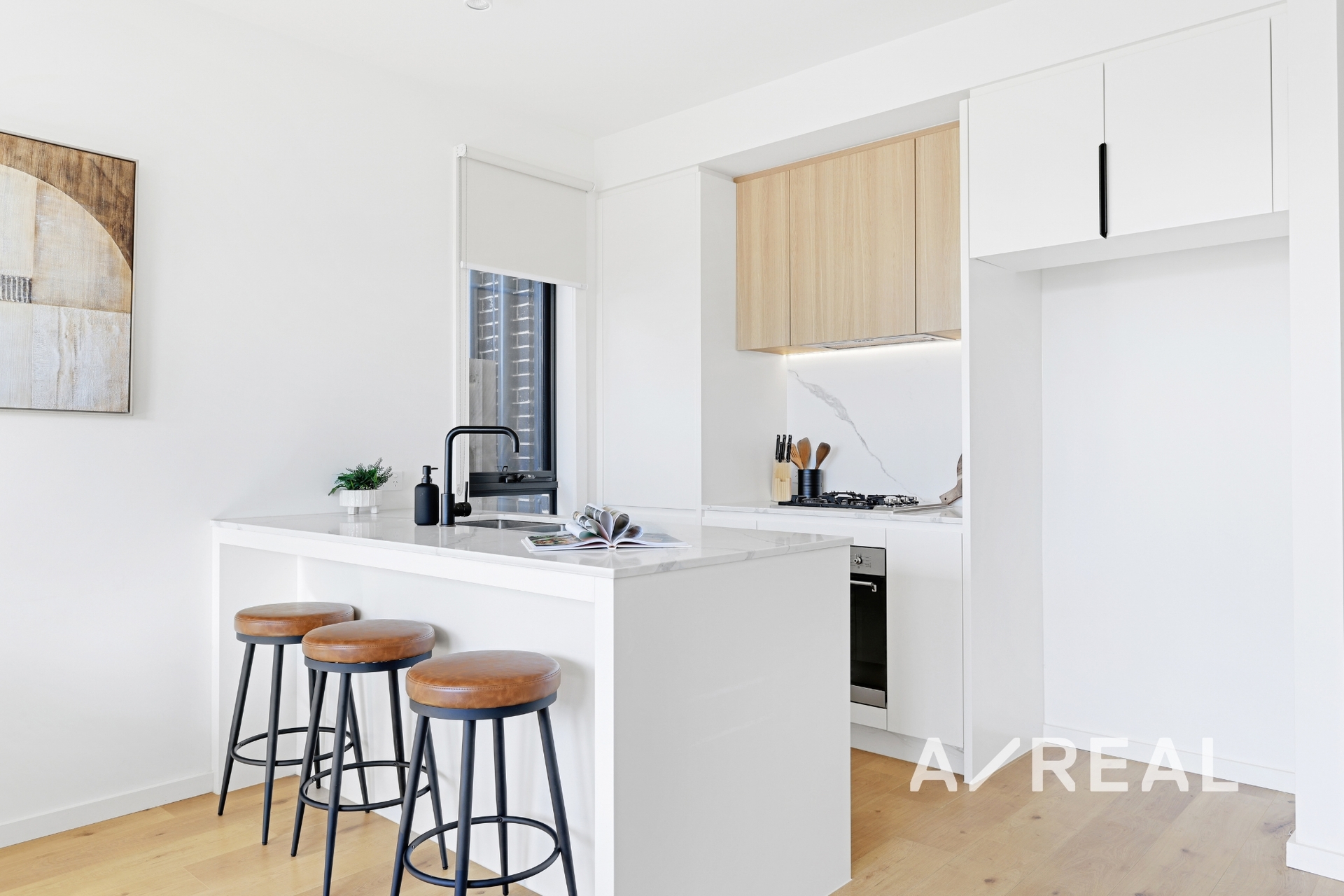 Devoted to lifestyle excellence and contemporary brilliance, timber floors and high-end finishes add prestige to the north-facing open-plan living/dining area, complementing a gourmet kitchen adorned with premium appliances, stone surfaces and island bench.