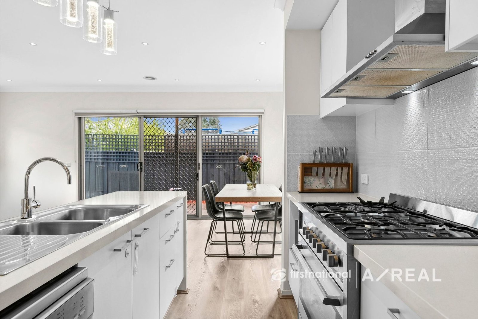 The gourmet kitchen boasts stone waterfall benchtops, a 900mm gas cooktop, and a walk-in pantry, ensuring an enjoyable cooking experience.