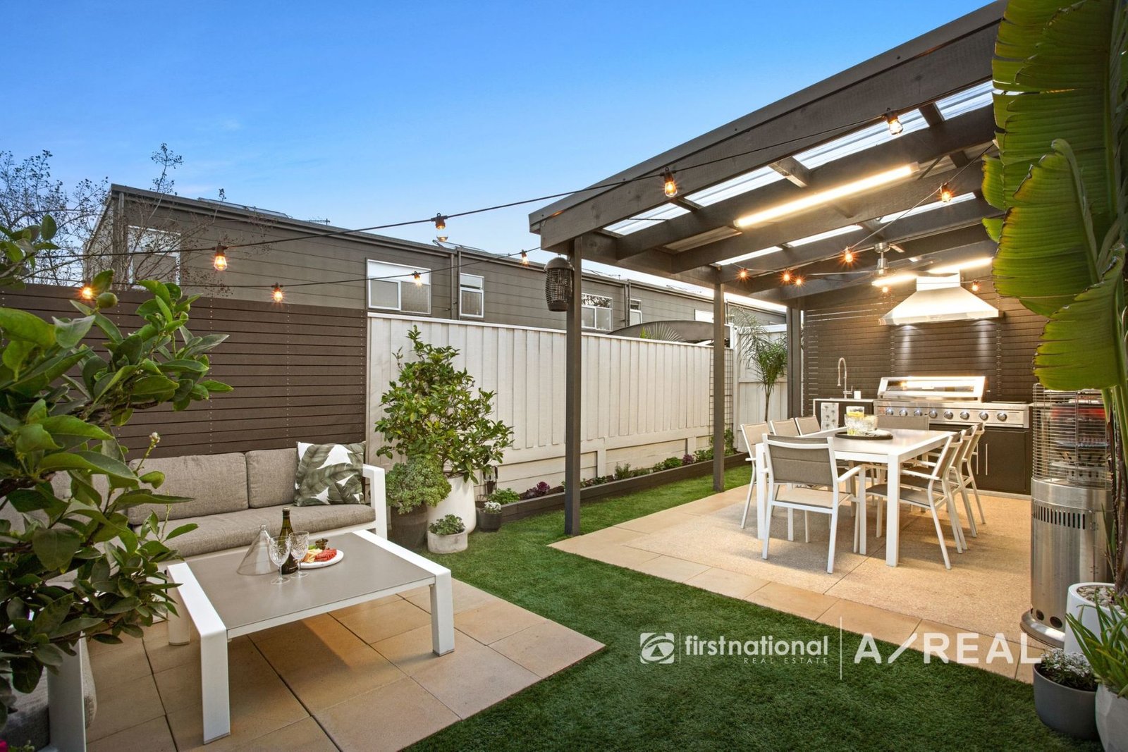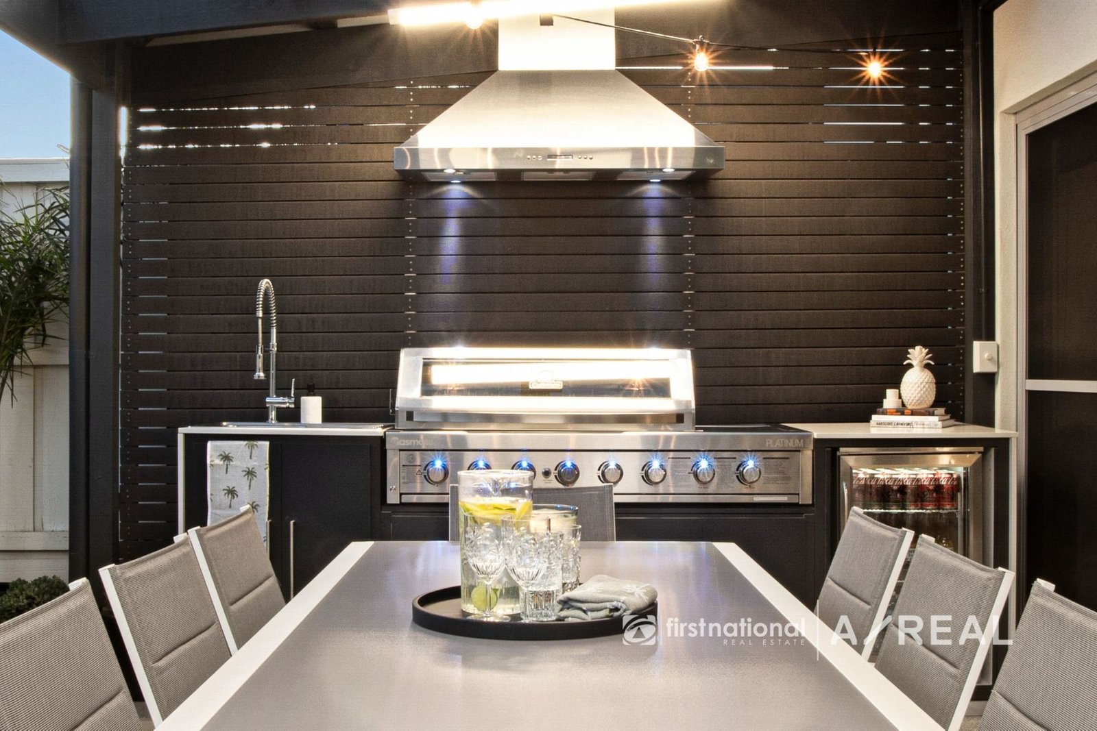 The outdoor space is an entertainer's dream. The alfresco area is equipped with a Gasmate Platinum 3 BBQ, 6-burner natural gas setup, complete with a stainless steel range hood and sink with hot/cold water. A mini bar fridge and custom BBQ cabinetry enhance the functionality, while festoon lighting and a stainless steel ceiling fan create the perfect ambiance. The herb and veggie garden, complete with irrigation, adds a delightful touch for those with a green thumb.