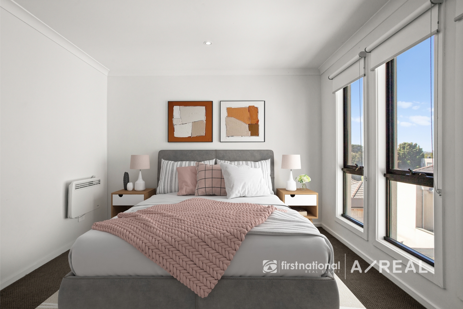 Upstairs, two spacious bedrooms await, each adorned with built-in wardrobes and bathed in natural light, offering a tranquil haven from the hustle and bustle of everyday life. The contemporary bathroom sports sleek fixtures and a crisp, clean design.