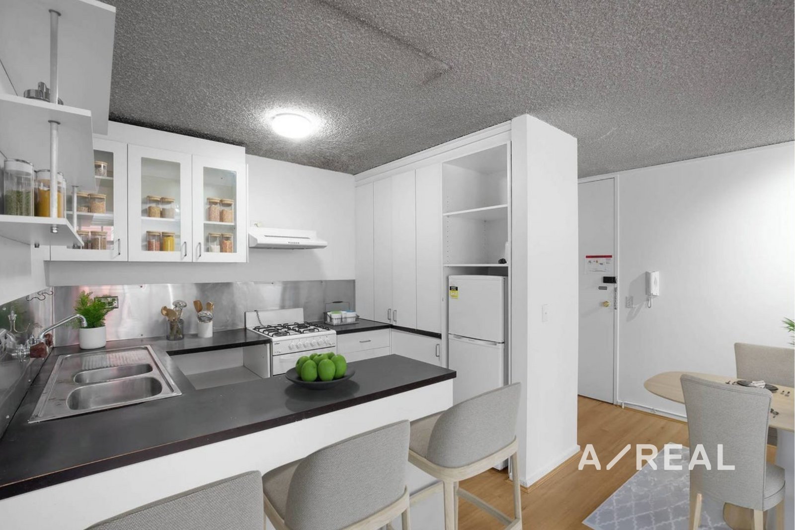 The well-equipped kitchen includes gas cooking and ample cupboard space, catering to both everyday living and entertaining needs. The oversized bedroom includes built-in robes and offers approximately 60m² of comfortable, well-designed space. The bathroom is fitted with a shower-over-spa bath and striking floor-to-ceiling tiles, adding a touch of retro charm. A rare inclusion is the separate laundry, enhancing the apartment’s overall functionality.