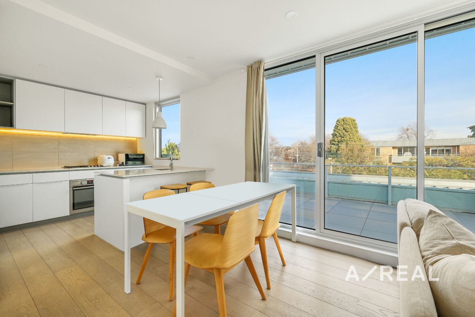 Welcomed by timber floors, neutral colour scheme and an inviting ambience, the open-plan layout is beautifully spacious and incorporates a sleek well-appointed kitchen boasting stone surfaces, stainless steel appliances and ample storage – highlighting both visual appeal and functionality.