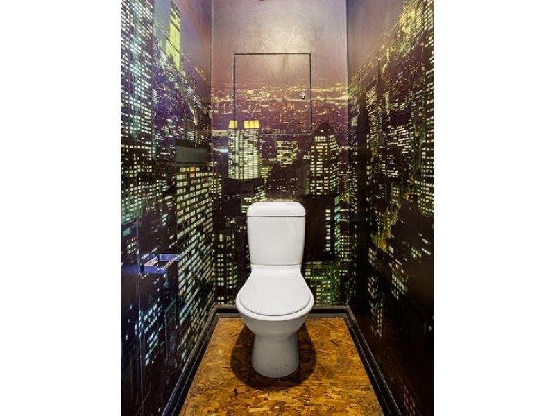 Separate toilet with floor to ceiling artwork