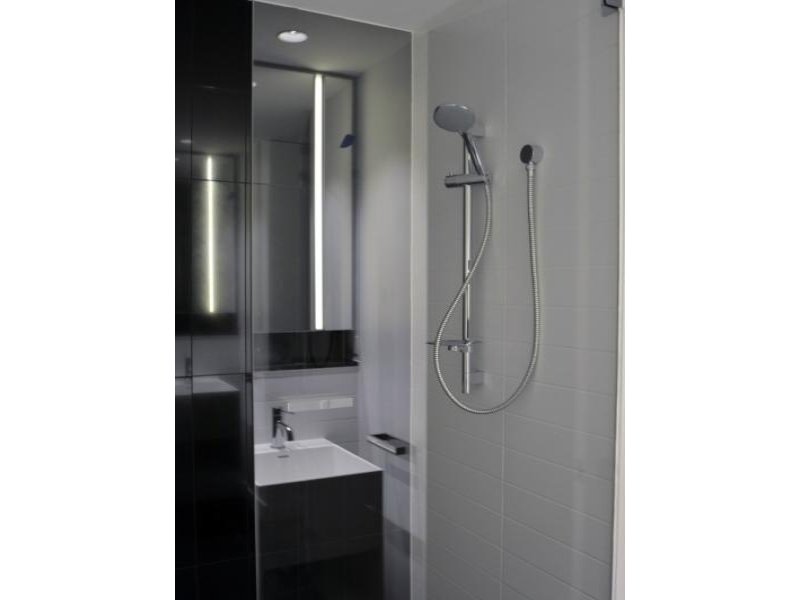 - Frame-less shower with hand held shower rose