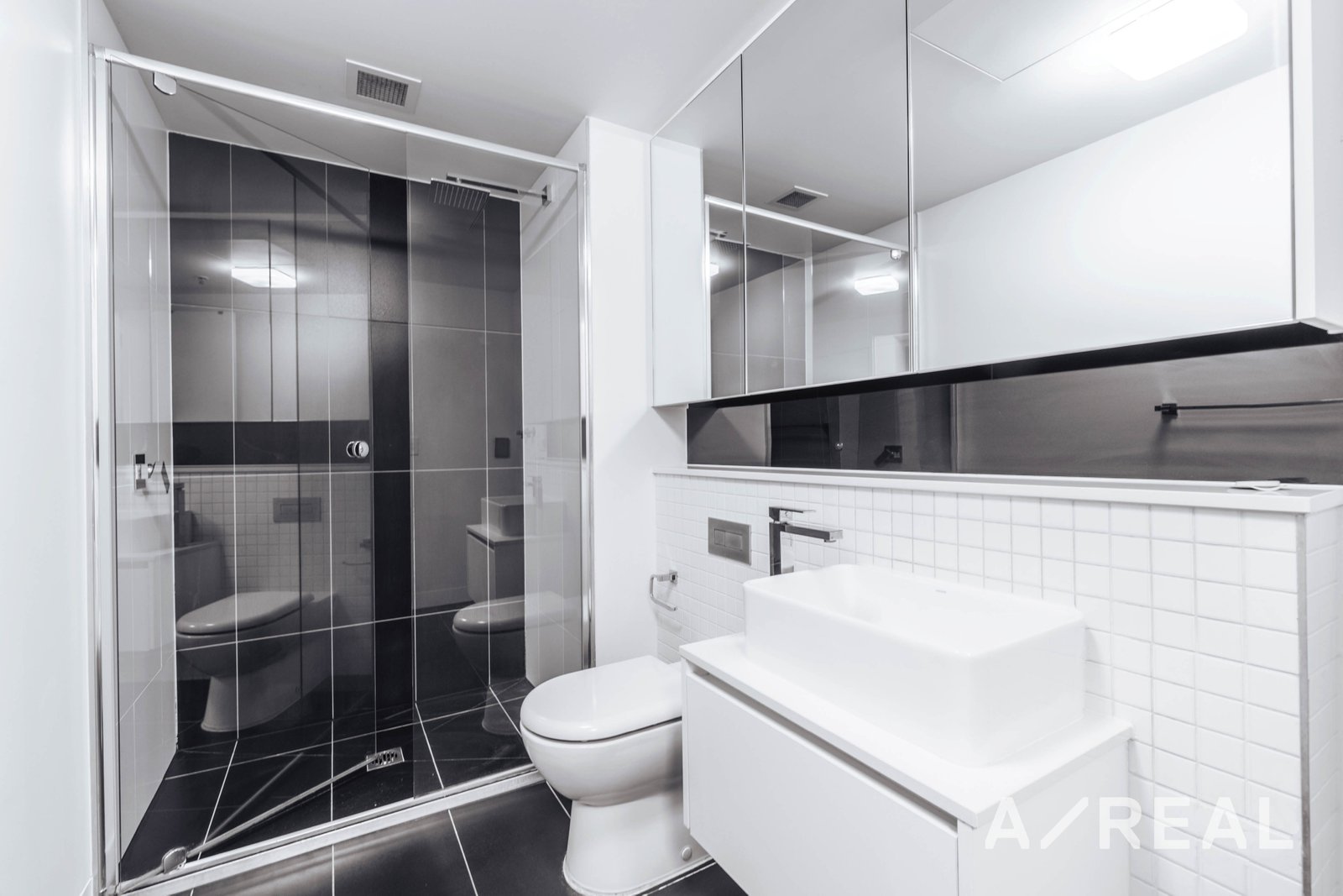 The apartment also includes a spacious bathroom with a Stunning frameless shower and washing machine taps