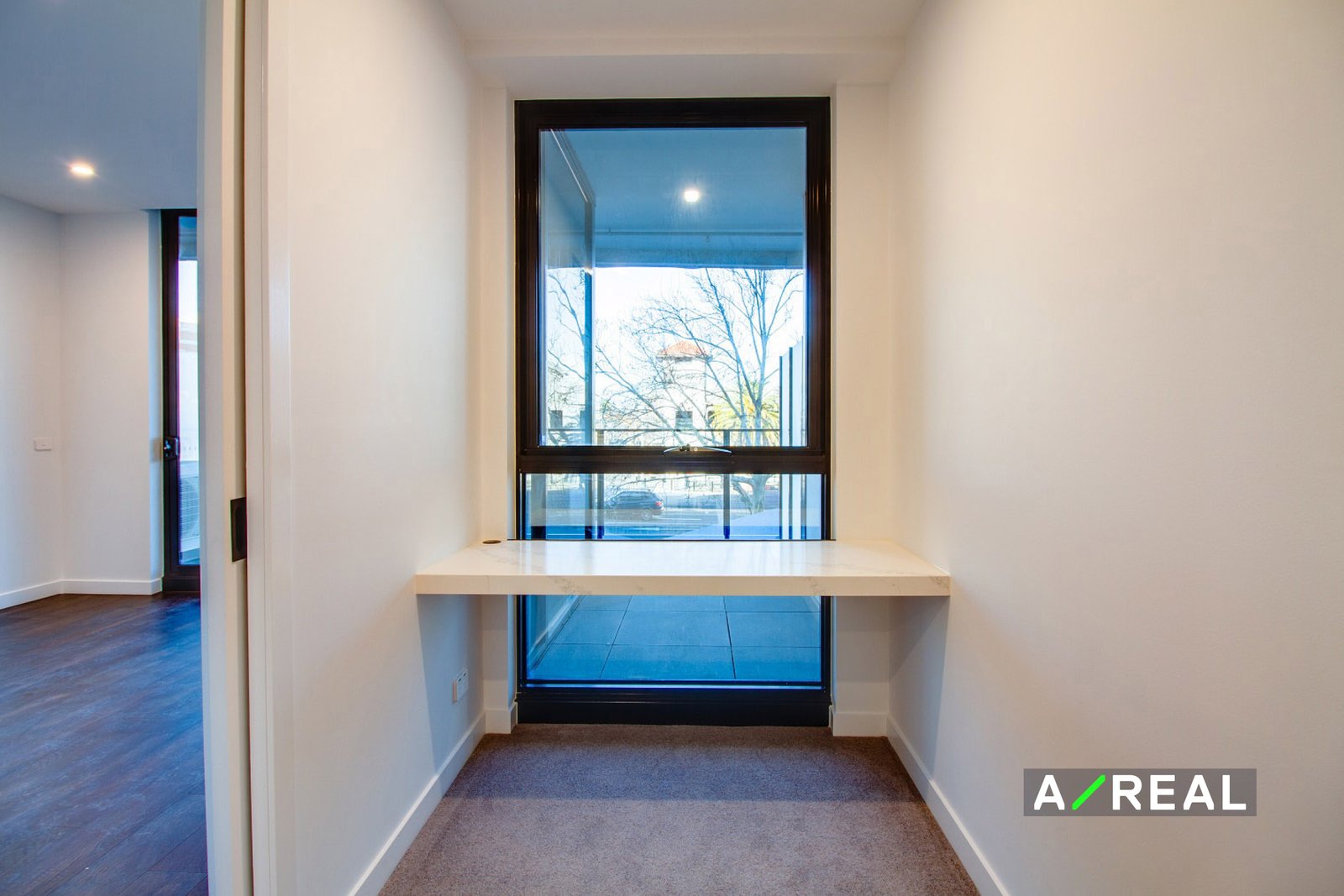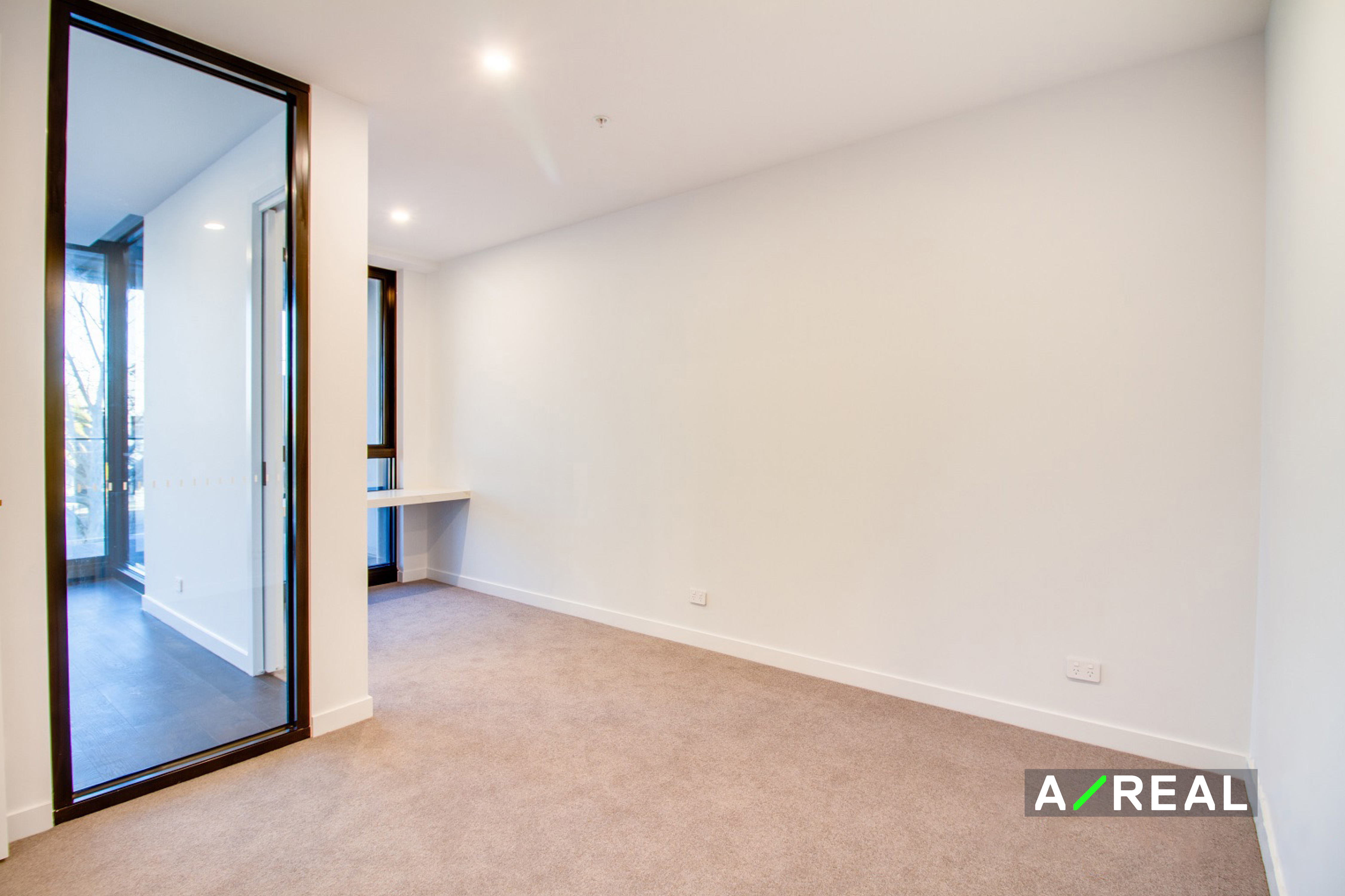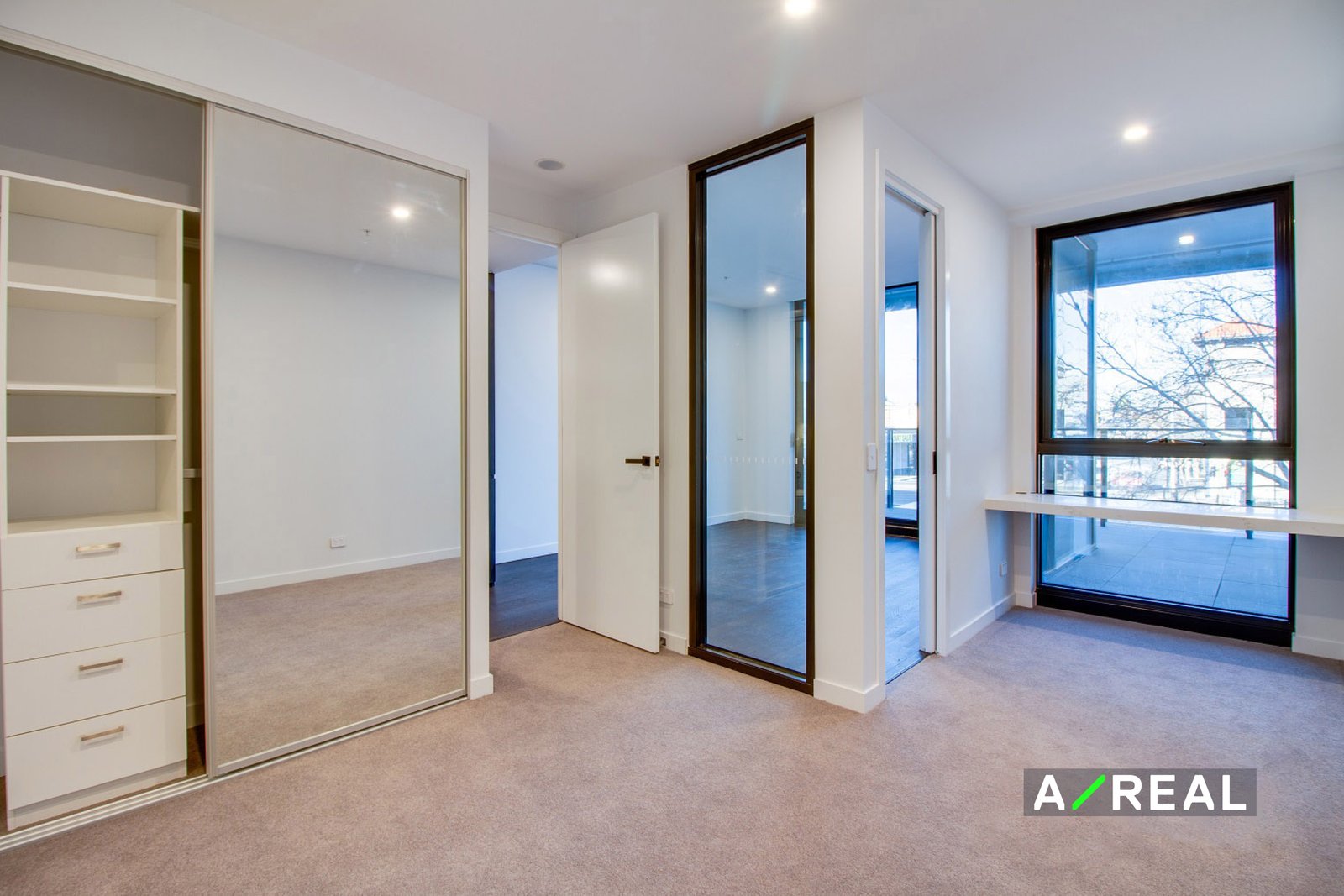 - Large, carpeted bedroom with a built-in marble desk, window facing study nook and a built-in mirrored wardrobe.