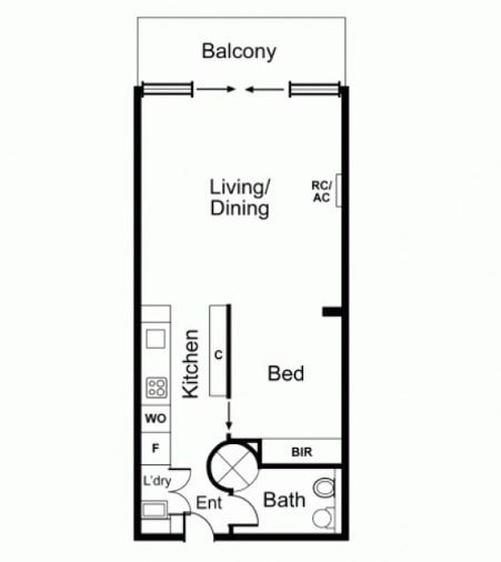 The 1 Bedroom modern apartment comprises a large air-conditioned living/dining room opening out through sliding doors to a light and bright enclosed balcony, a well-equipped galley-style kitchen featuring stone benches and stainless steel Smeg appliances, European laundry, a stylish bathroom and bedroom with full-length robes.