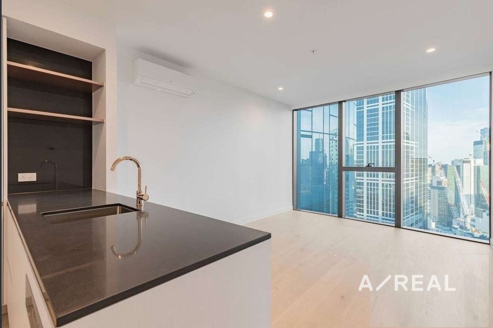 In immaculate condition, this unfurnished 1-bedroom apartment boasts spectacular views through floor-to-ceiling windows. The open-plan living area features timber flooring and a contemporary kitchen with stone benchtops, gas cooktop, oven, dishwasher, and integrated storage with fridge space.