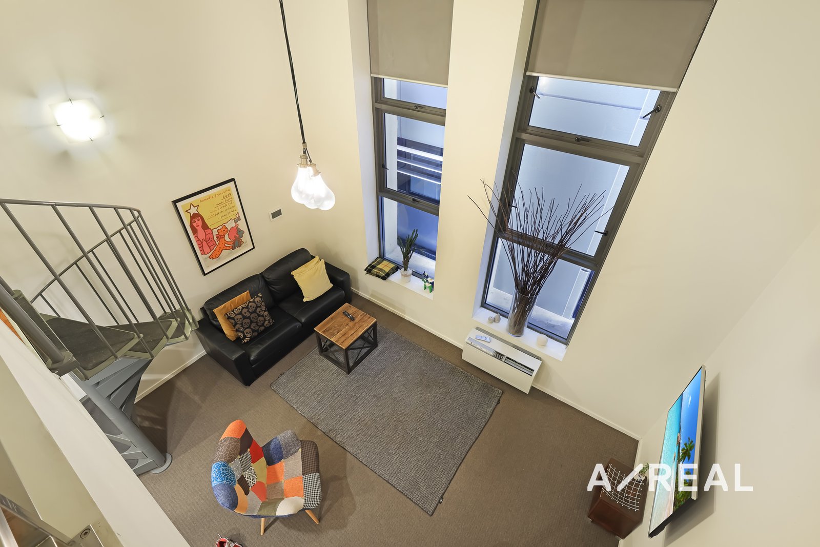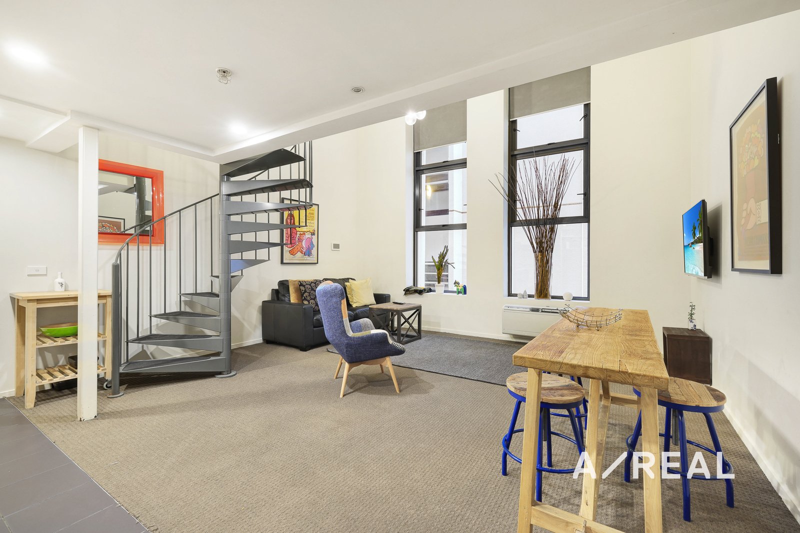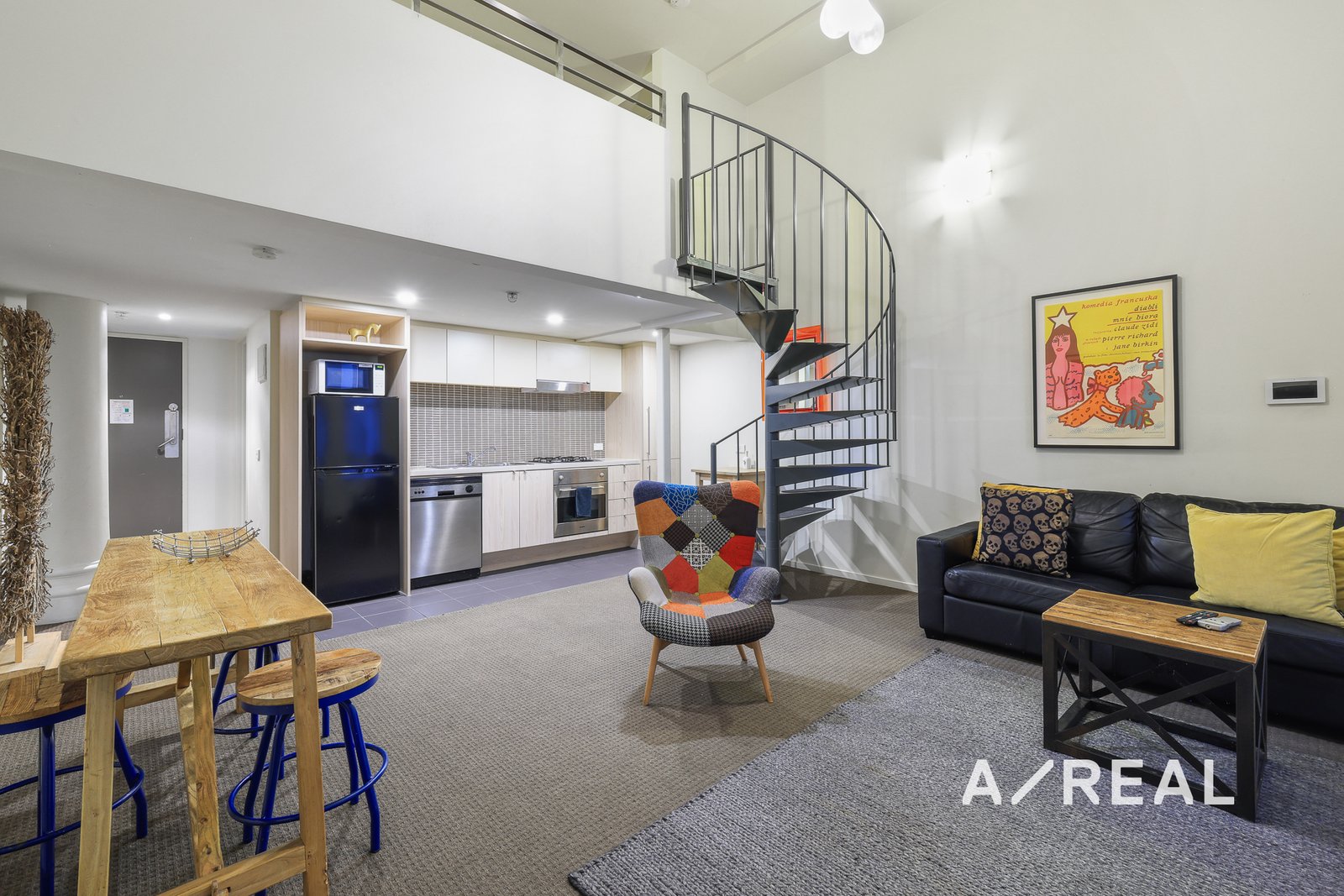 A unique metal spiral staircase serves as a centerpiece in the lounge, leading to the spacious loft-style bedroom. The bedroom features floor-to-ceiling mirrored built-in wardrobes, offering ample storage and enhancing the sense of space and light.