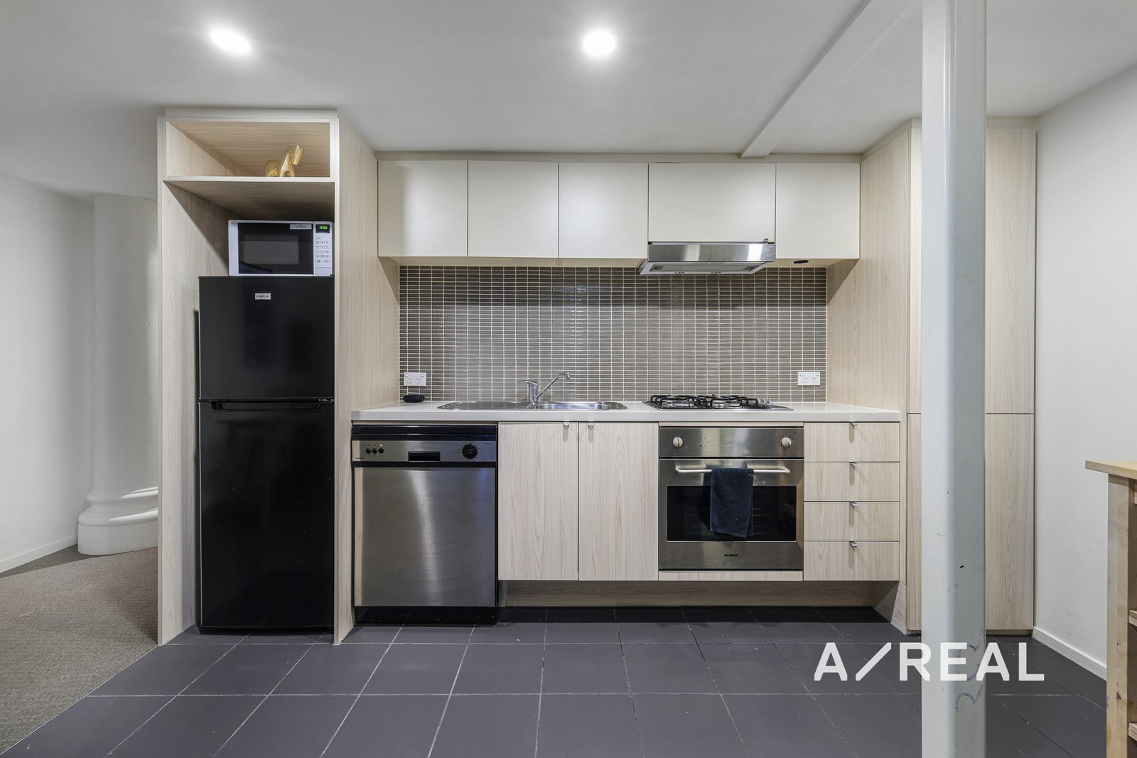 Step through the entryway into a bright and airy open-plan living and dining area, complemented by a sleek, contemporary kitchen equipped with a gas stove, oven, and dishwasher perfect for everyday living and entertaining.