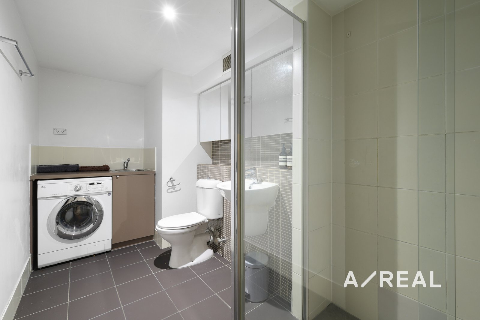 The stylish bathroom is modern and practical, complete with integrated laundry facilities for your convenience.