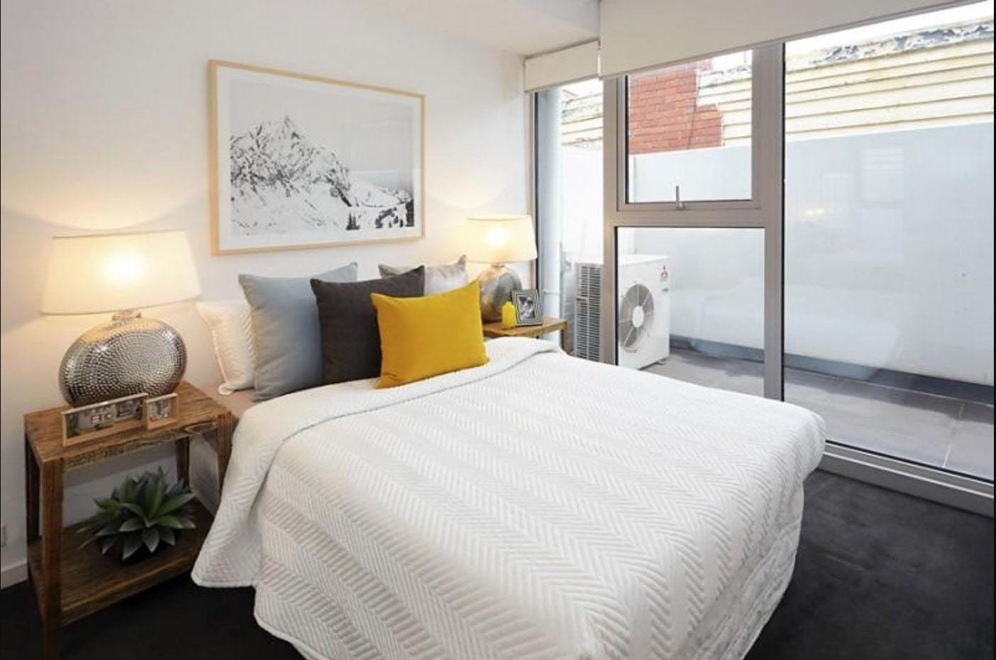 Light filled one bedroom apartments beautifully appointed. This one bedroom apartment is available on the second floor and comes with; secure entrance, generously sized bedroom with BIR, black Caesar Stone kitchen bench with stainless steel appliances including dishwasher. A bathroom. Split system AC and electric panel heaters in the bedroom. Private balcony and the bonus of one off street secure parking and storage cage available.