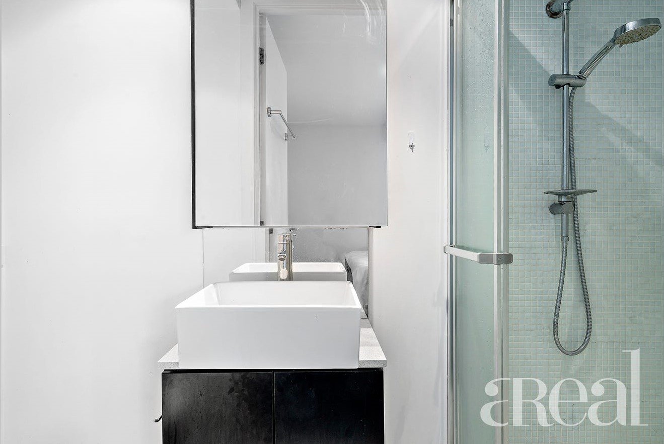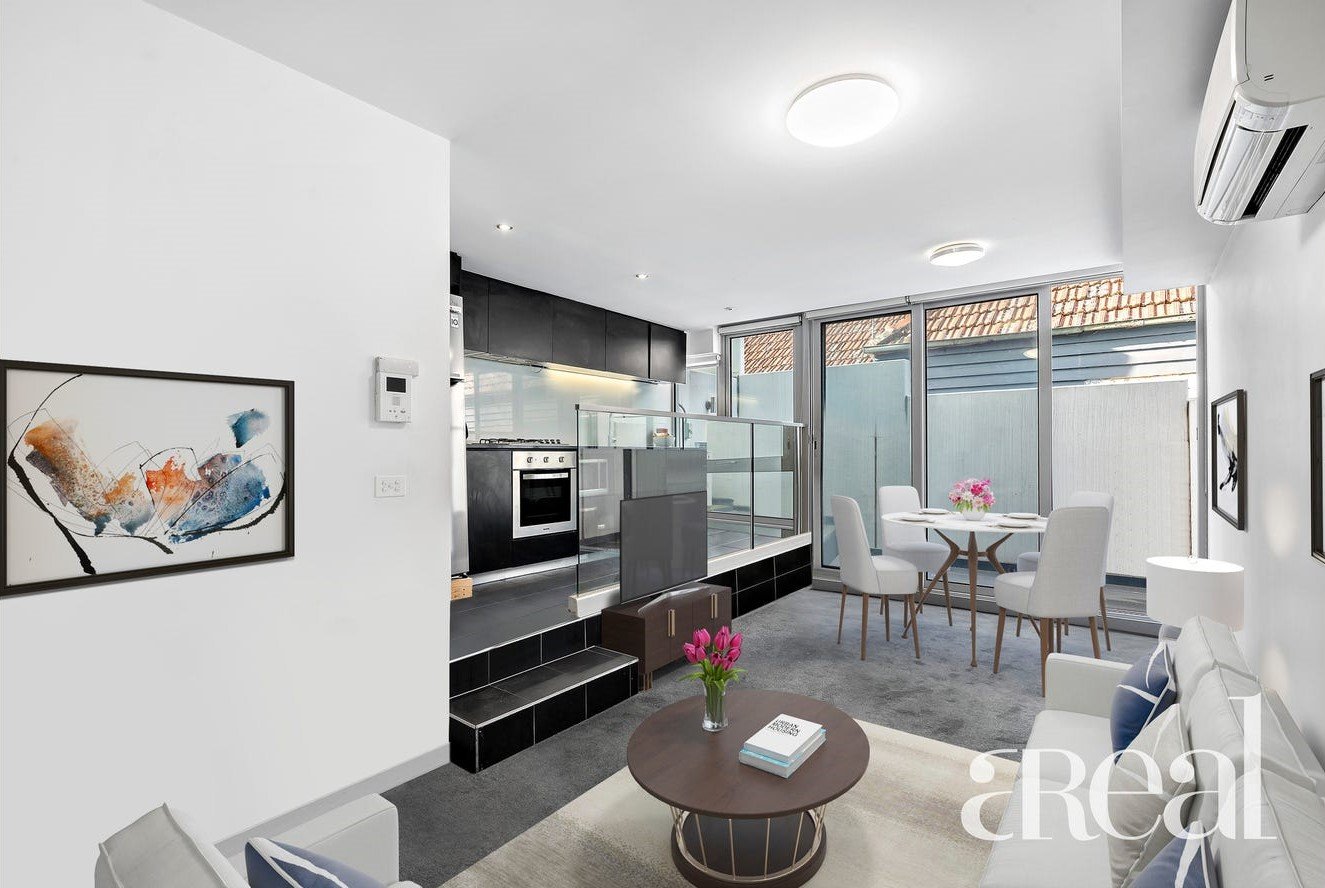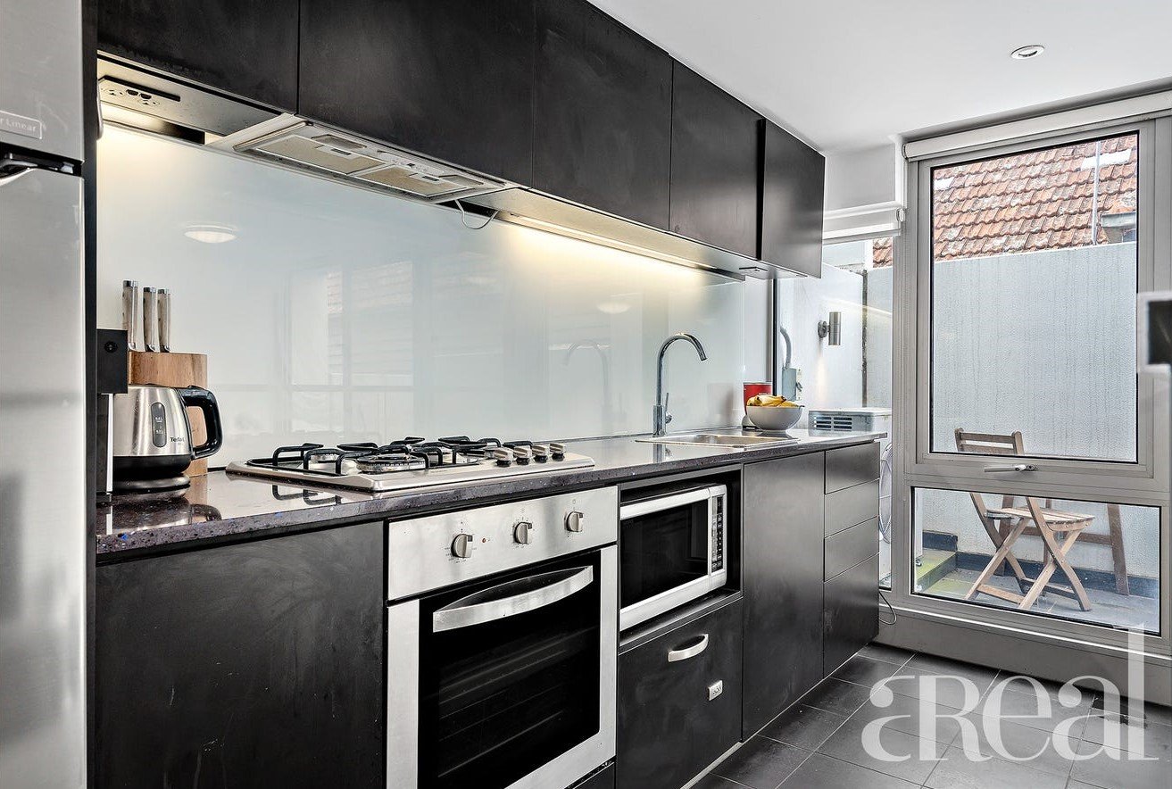 The unique layout features a light-filled and air-conditioned living and dining room with the kitchen elevated and open making it ideal for entertaining. There are stainless steel appliances and sleek black cabinets along with glass balustrading that separates the kitchen from the living room without closing off the space. A wall of floor-to-ceiling glass sliding doors opens to the sunny and private balcony with plenty of room to host guests, dine outdoors or cook on the barbeque on warm summer nights.
