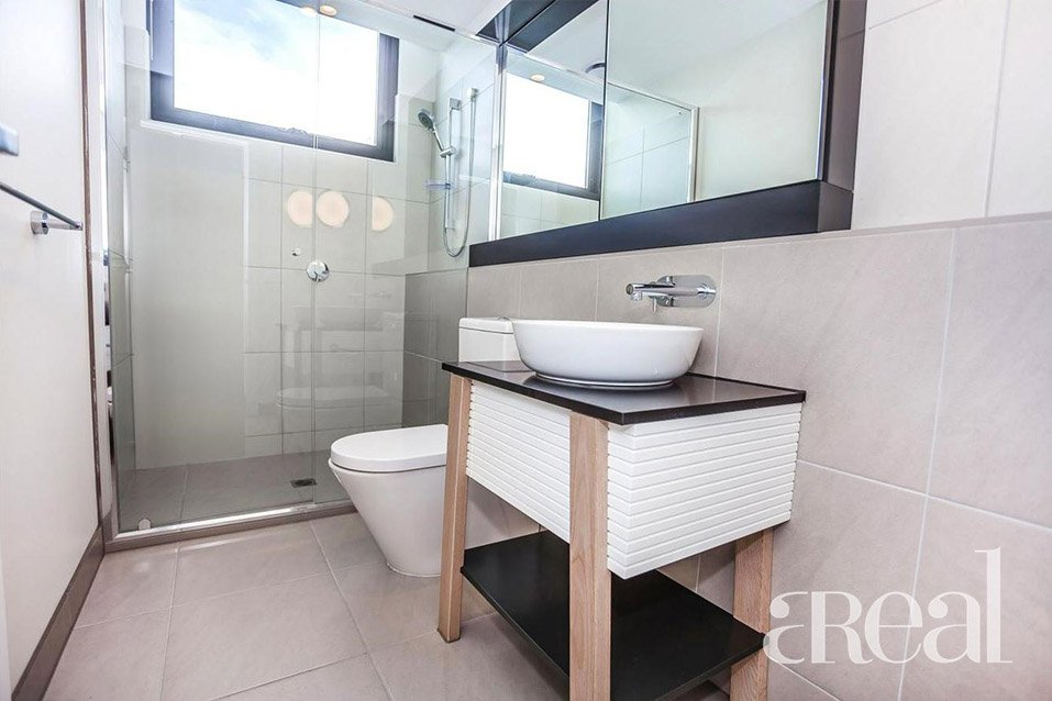 - Modern bathroom with both door to hallway and a sliding door to bedroom.