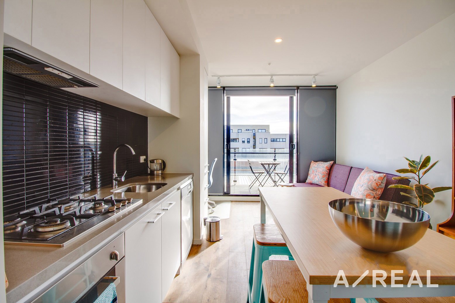 The apartment’s modern kitchen oversees a contemporary living and dining area, opening to a spacious north facing balcony.