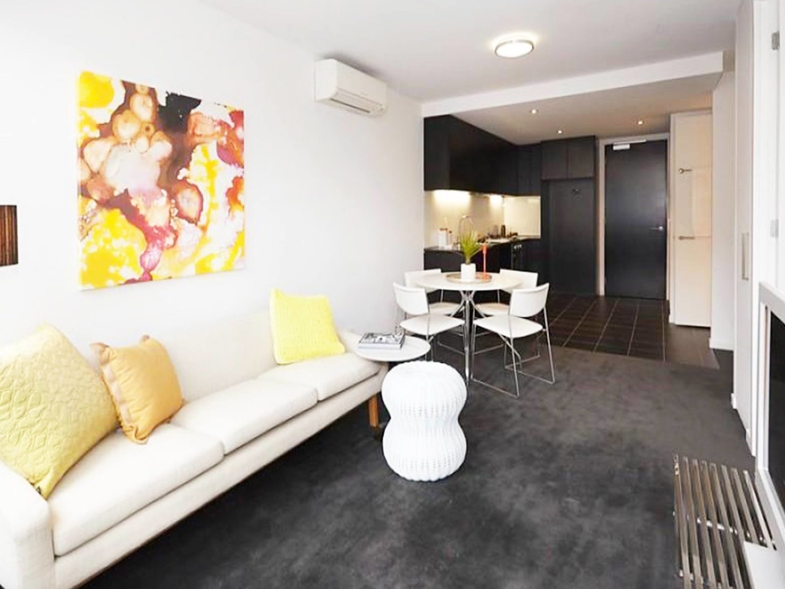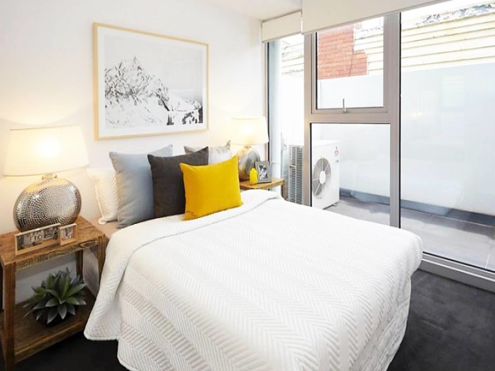 Light filled one bedroom apartments beautifully appointed. This one bedroom apartment is available on the second floor and comes with; secure entrance, generously sized bedroom with BIR, black Caesar Stone kitchen bench with stainless steel appliances including dishwasher. A bathroom. Split system AC and electric panel heaters in the bedroom. Private balcony and the bonus of one off street secure parking and storage cage available.