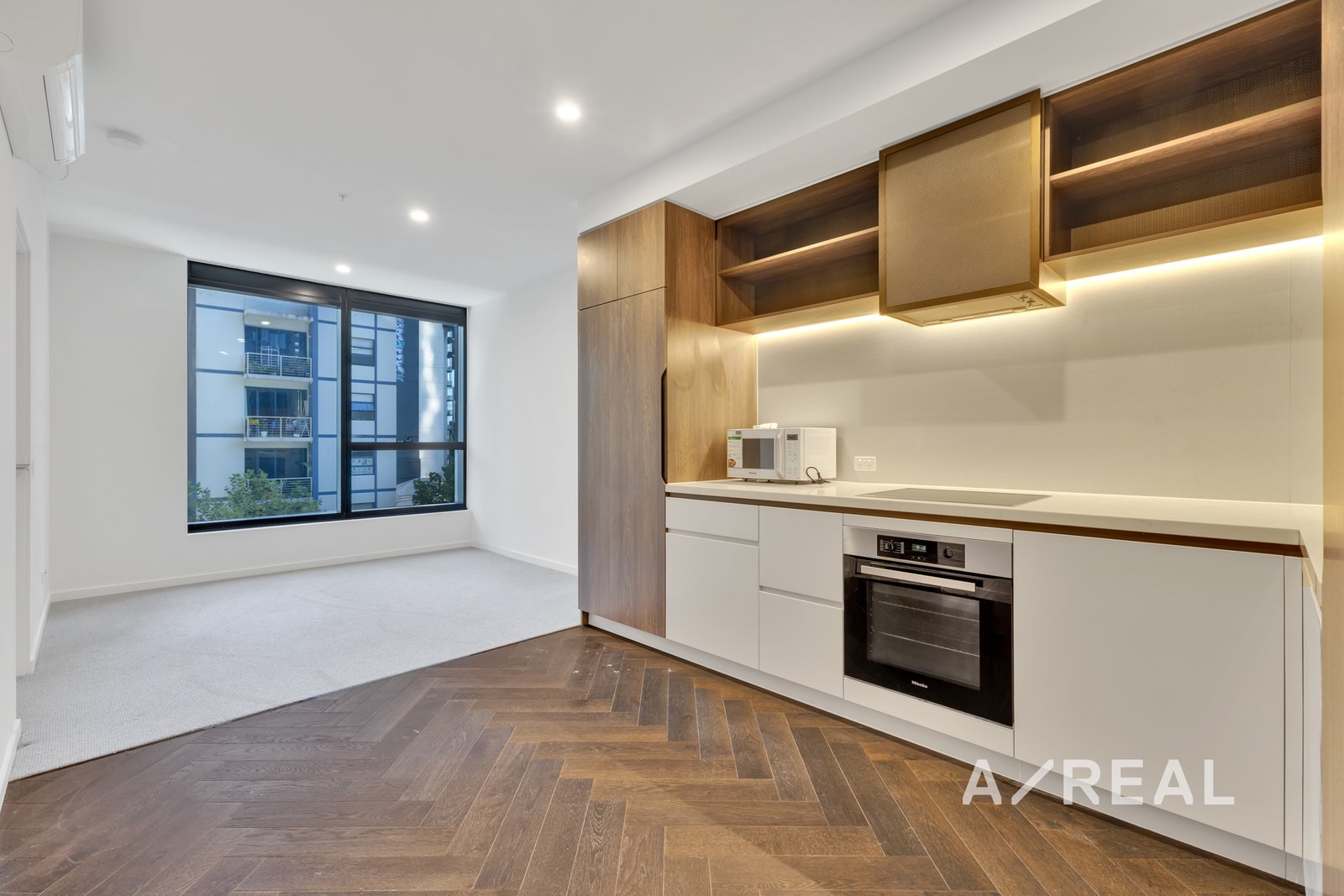 The state-of-the-art kitchen is equipped with premium Miele appliances, sleek cabinetry, and elegant stone countertops—perfect for culinary enthusiasts and hosting guests. The sophisticated bathroom showcases exquisite finishes, including a rainfall shower and ample storage, ensuring a serene retreat.