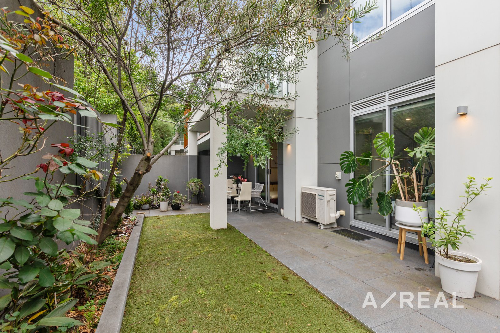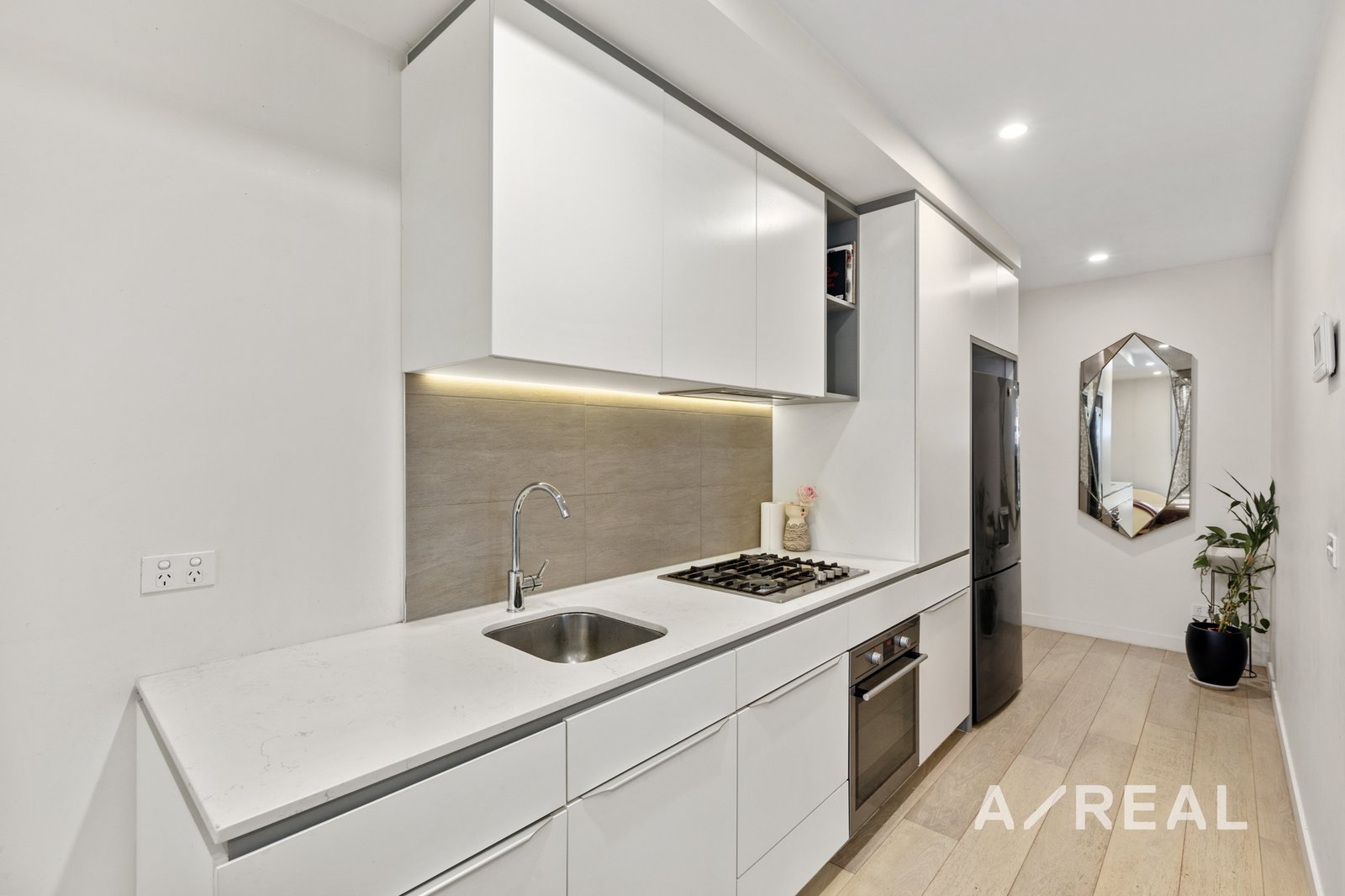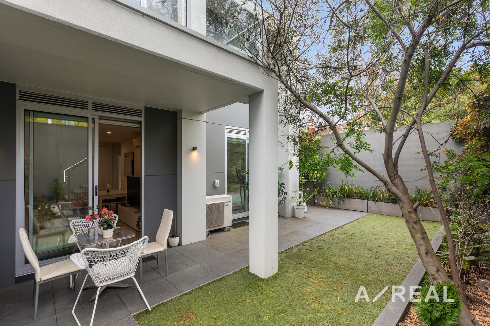 Stone-topped kitchen benches, soft close cabinetry, an under-mount sink and stainless steel gas appliances indicate a commitment to quality in a kitchen and open-plan meals/living that flows outdoors to a partly paved and partly undercover garden which more than doubles the amount of available living space. Accessed both privately and via secure video entry on Violet Grove, the apartment also features a private master bedroom ensuite, secure basement parking, as well as elevator access, mirrored robes in each bedroom and split system heating/cooling.