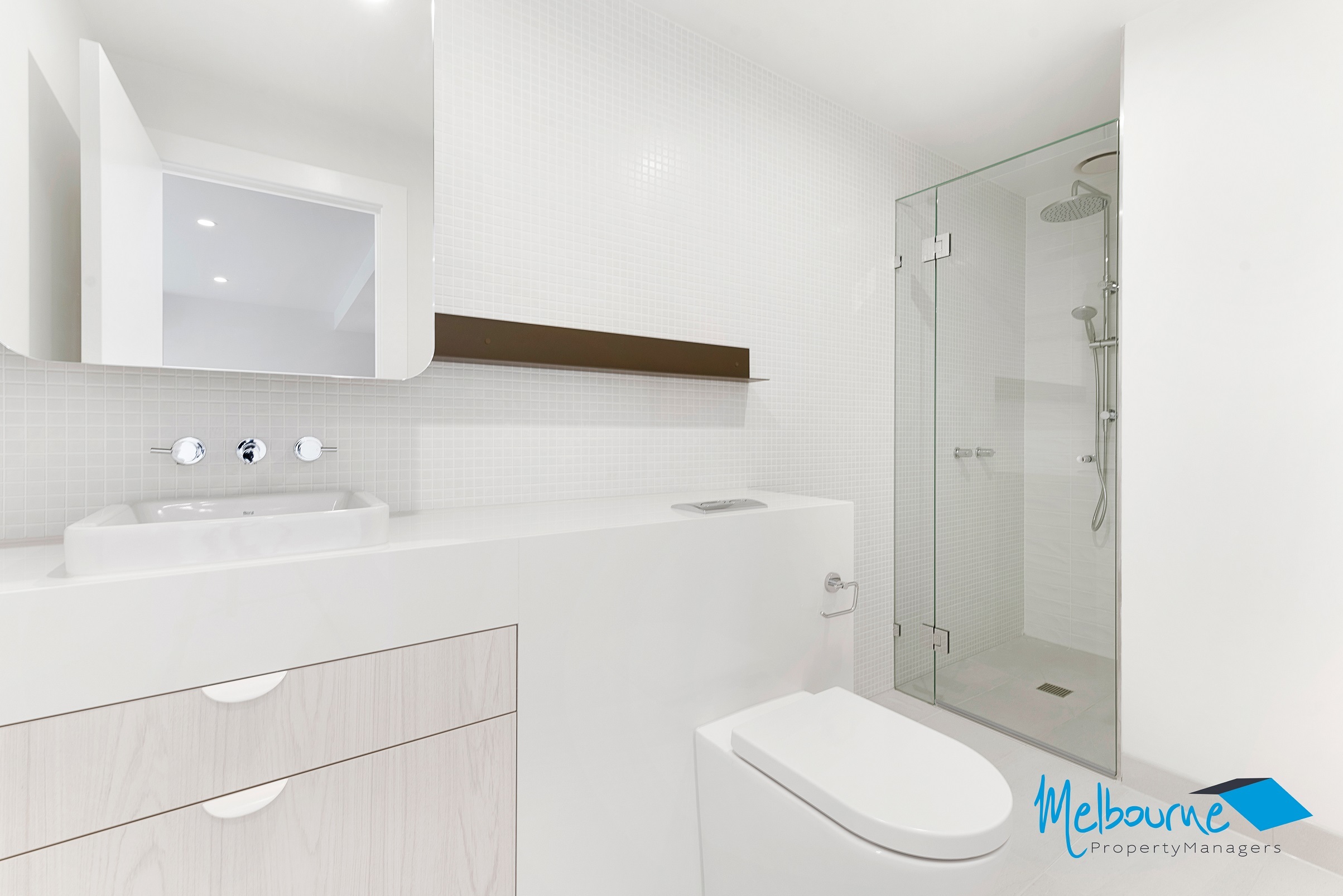 The elegant bathroom is designed with skilful detailing, from the contrasting feature tiling to the shapely curves of the mirrors and basins at the marble vanity. Featuring rain head showers, stainless steel fixtures, ample shelving and storage space, the bathroom in this stunning apartment offers chic, luxurious efficiency.
