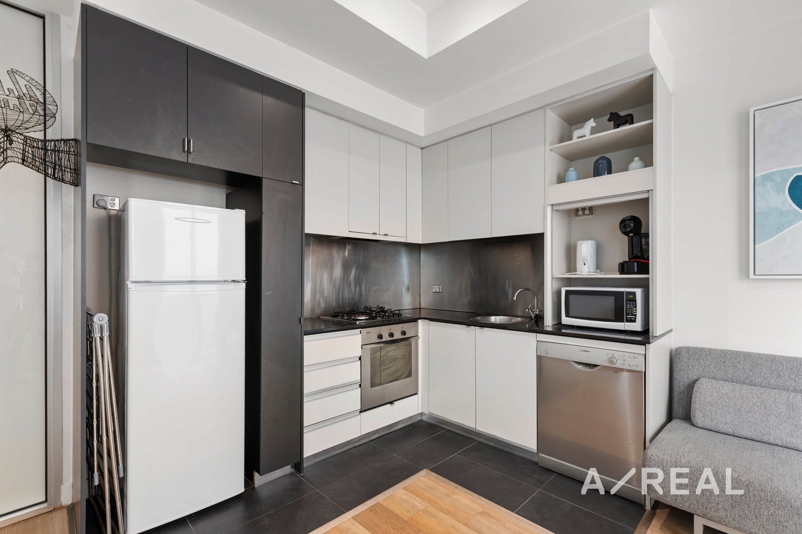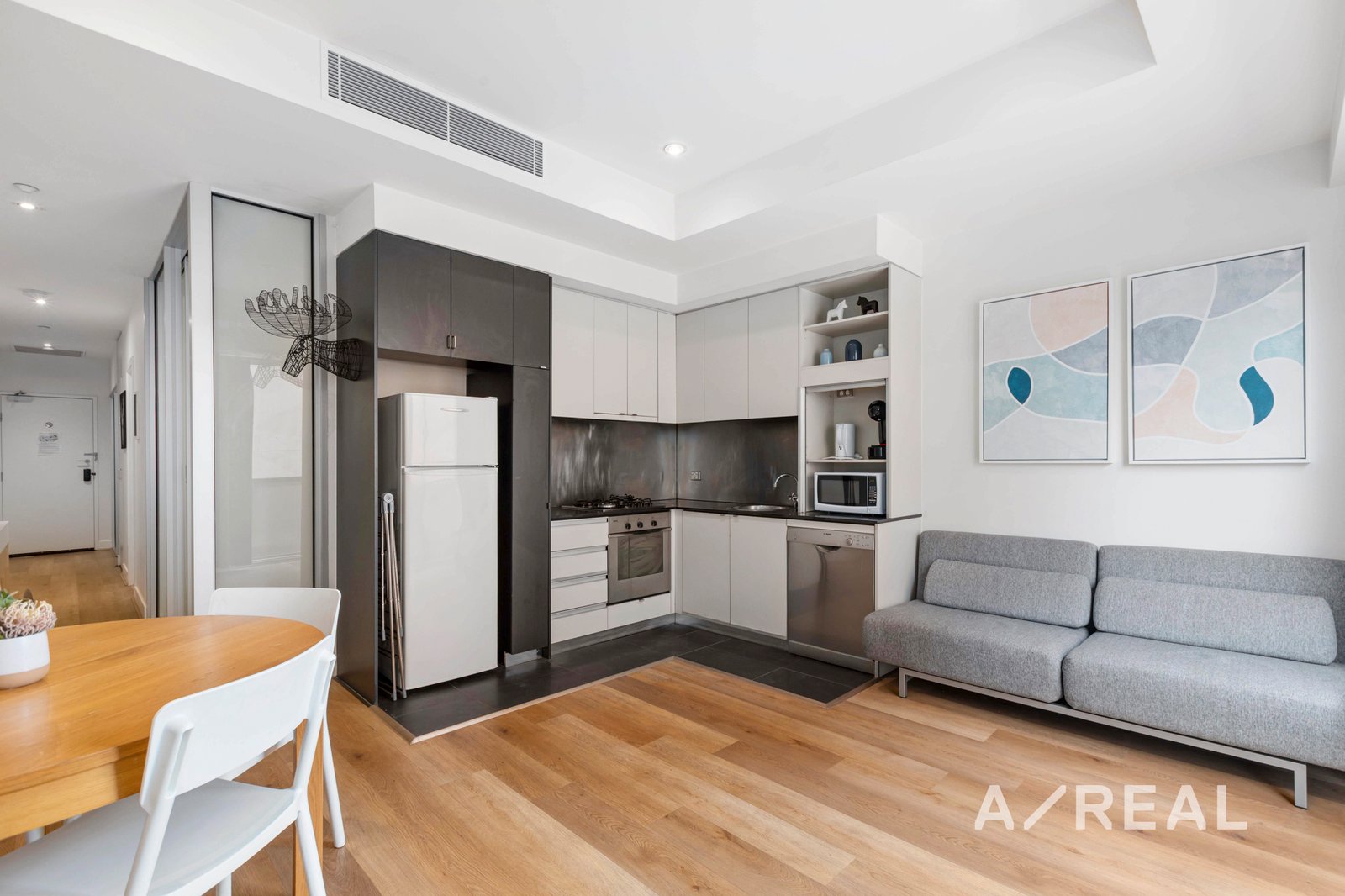 The open-plan living and dining area is filled with natural light and opens to a private balcony, creating a relaxing space to unwind or entertain. The sleek kitchen features stainless steel appliances, gas cooktop, and ample storage, seamlessly blending functionality with modern design. A separate bedroom offers peace and privacy, complemented by built-in robes, while the chic bathroom is generously sized with a full bathtub and stylish finishes.