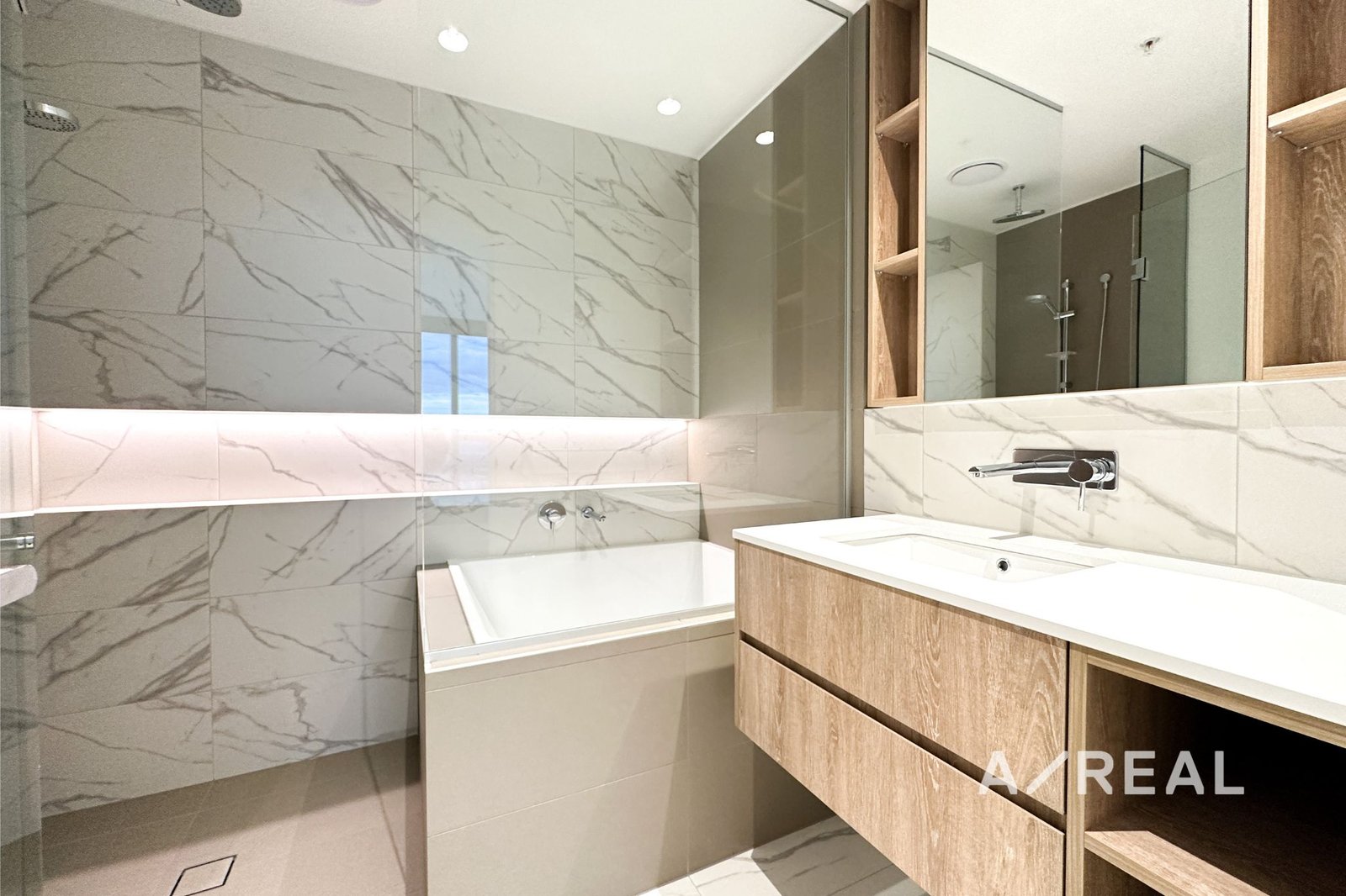 The modern kitchen is a standout, featuring premium appliances including a dishwasher, an elegant marble splashback, and a sophisticated LED strip light. Each bedroom is generously sized and includes built-in robes and striking floor-to-ceiling windows that bright up the space with natural light, creating a peaceful urban retreat.