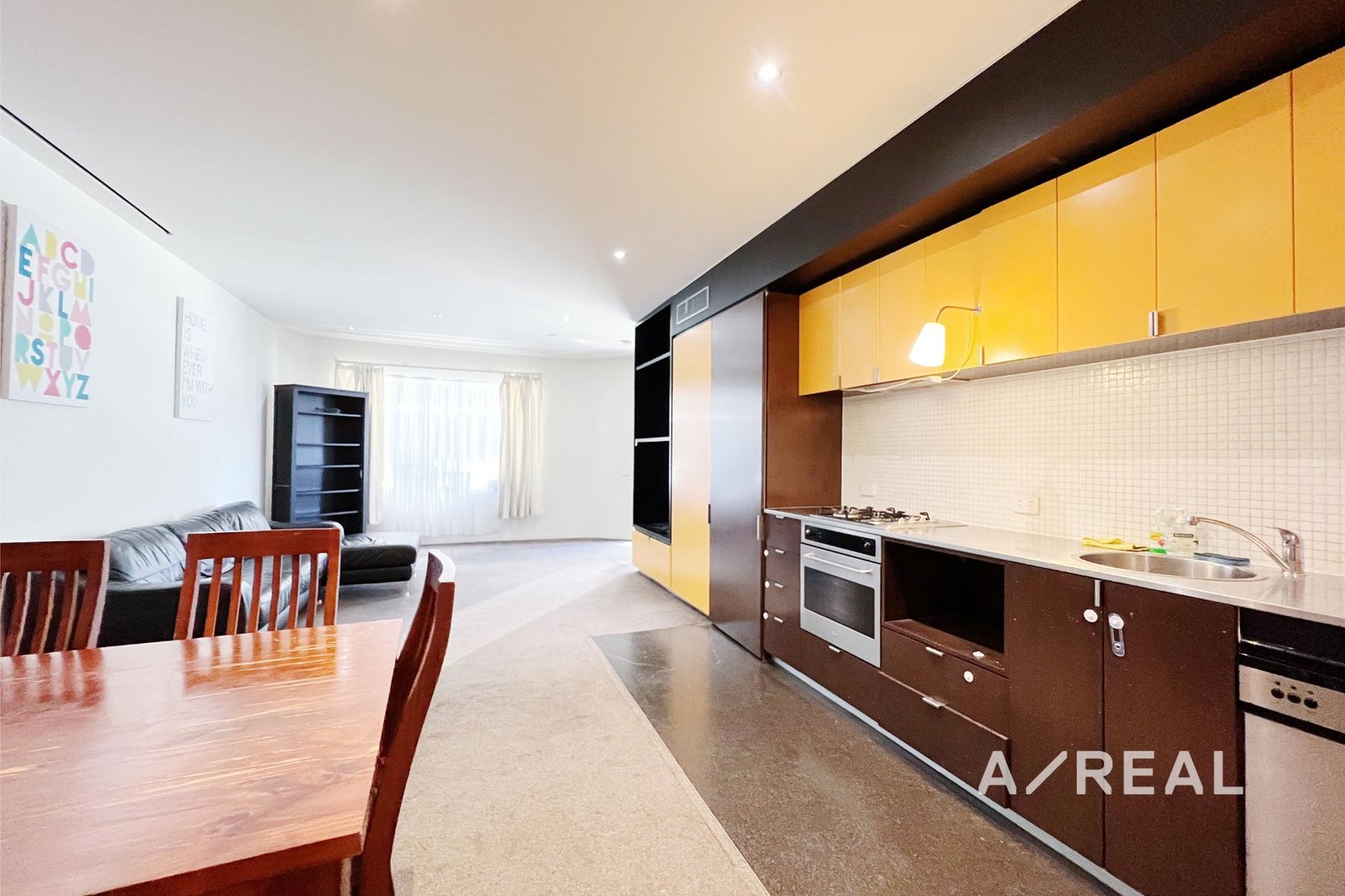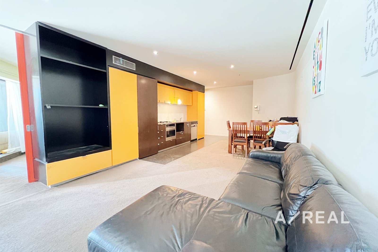The open-plan living and dining area is enhanced by floor-to-ceiling windows, creating a bright and welcoming space that connects to a sleek kitchen complete with stone benchtops, stainless steel appliances, and generous storage. The main bedroom features a built-in wardrobe and soft carpet, while the separate study is ideal as a spare room or private home office. A modern bathroom, split system heating and cooling, and secure building access ensure complete comfort and convenience.