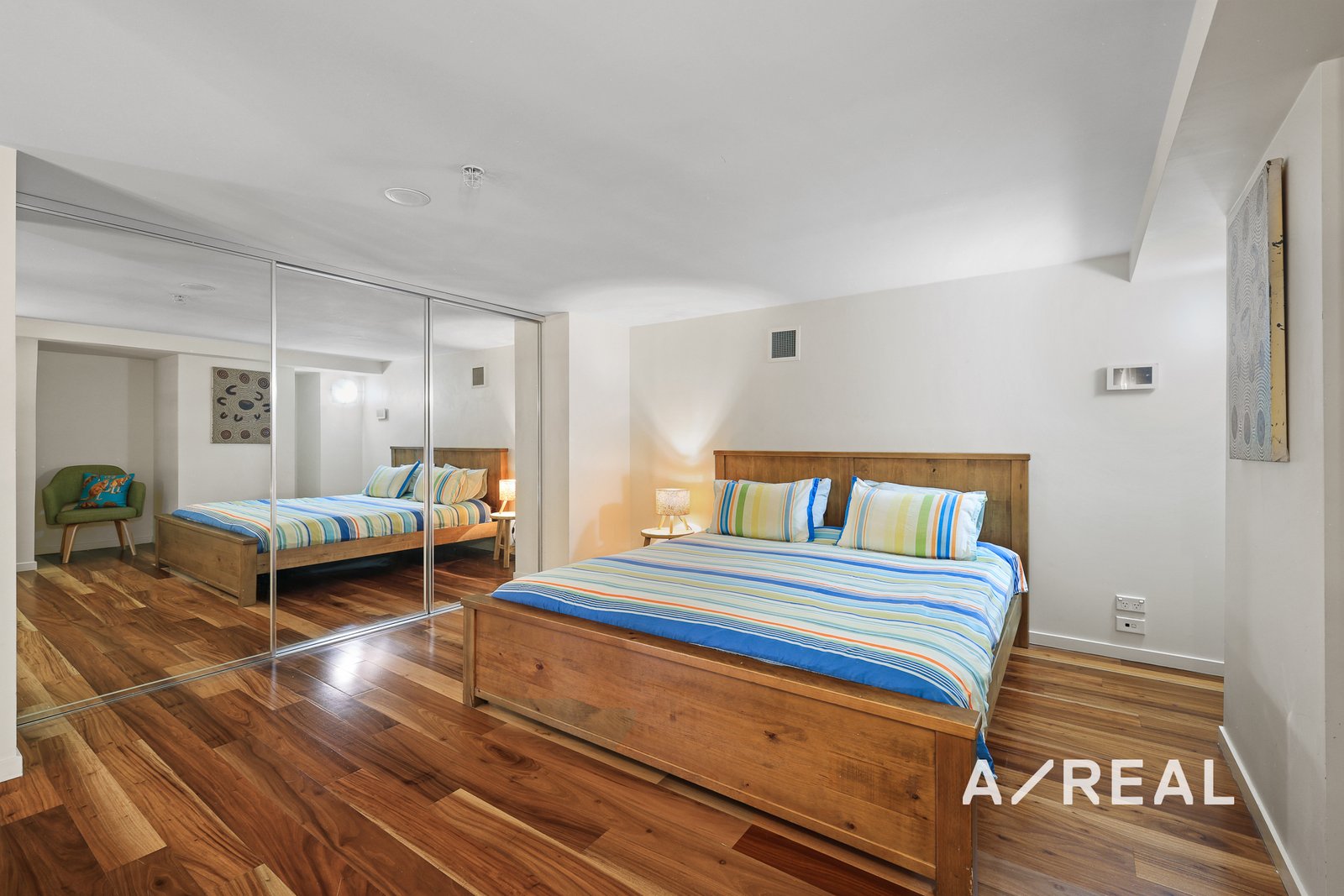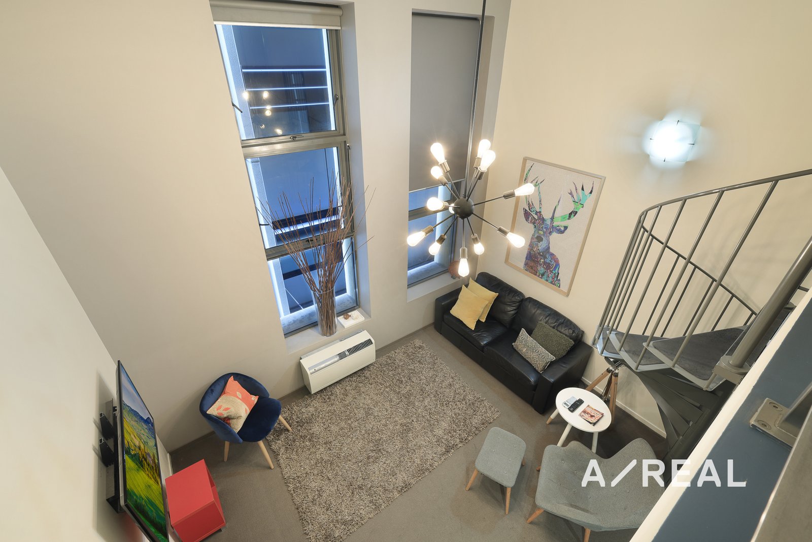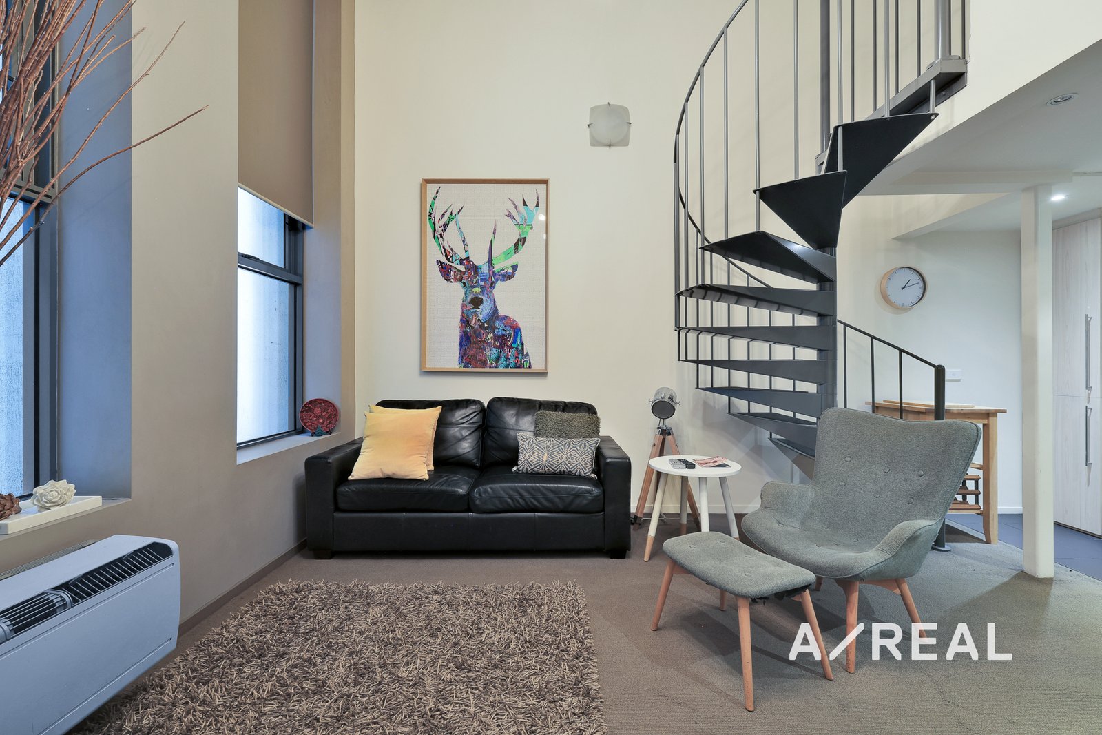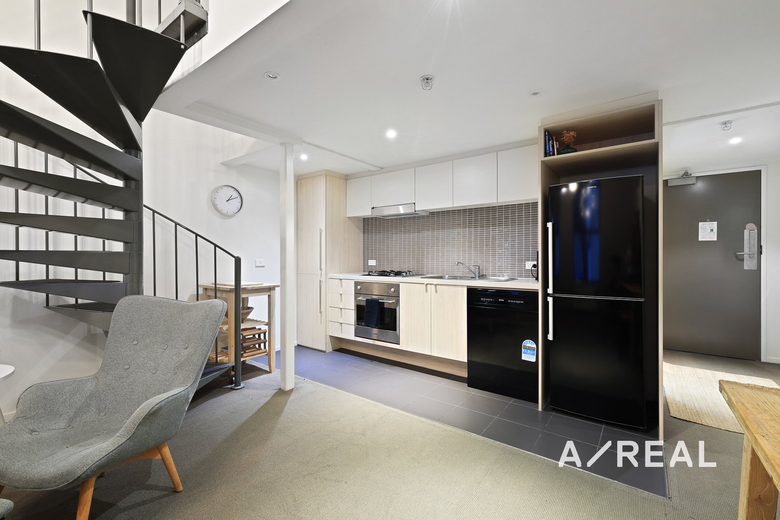 A unique metal spiral staircase serves as a centerpiece in the lounge, leading to the spacious loft-style bedroom. The bedroom features floor-to-ceiling mirrored built-in wardrobes, offering ample storage and enhancing the sense of space and light.