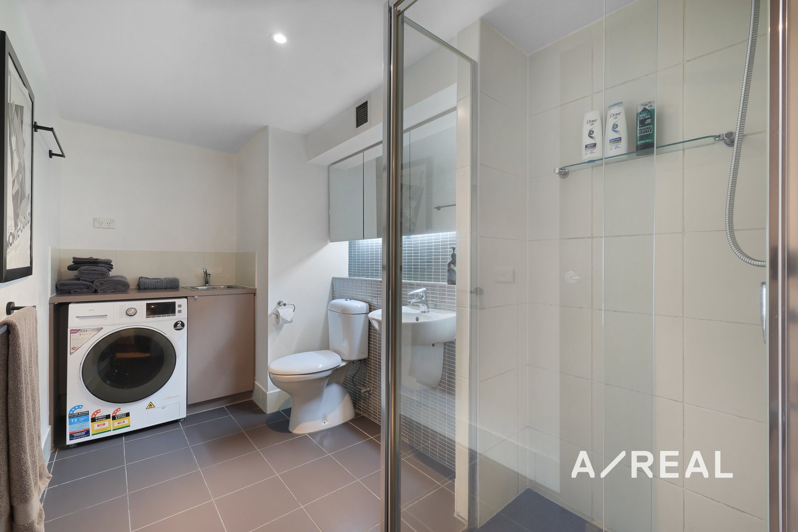 The stylish bathroom is modern and practical, complete with integrated laundry facilities for your convenience.