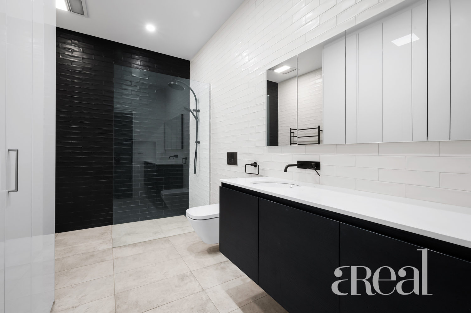 Main bathroom has just been renovated with floor-to-ceiling tiles, a large open shower, double vanity, European laundry with ample storage also a Bosch washing machine that comes with the apartment.