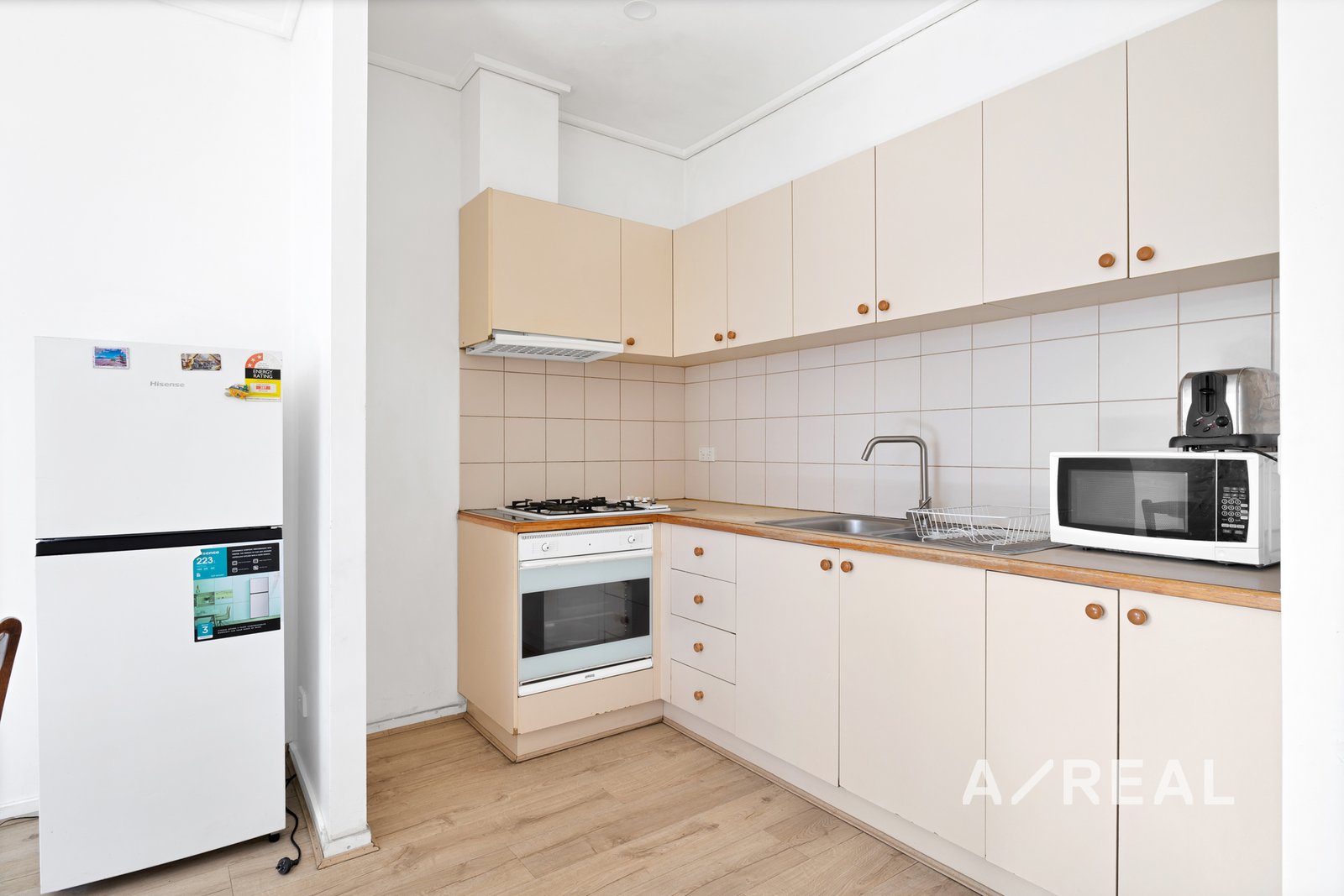 The well-equipped kitchen boasts ample bench and storage space, complemented by a four-burner gas cooktop. Both generously sized bedrooms feature built-in robes, while the sleek bathroom offer laundry capacity for added convenience.